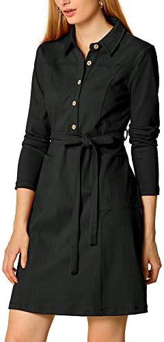 Allegra K Women’s Chambray Dress ​Half Placket Long Sleeve ‌Belted Casual ⁢Safari ‍Dress X-Small Black