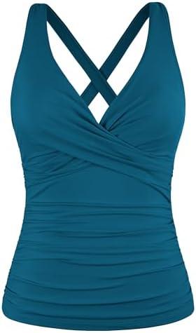 Crafted with an underwire design and soft removable pads, this tankini top ensures superior bust support and shaping, making it a great choice for women with larger bust sizes. The twist v-neck and crisscross back add a touch of elegance while also providing a comfortable fit with adjustable straps. Flattering waist ruching allows for a tummy control effect, helping you feel confident and secure whether you’re at the pool or beach.