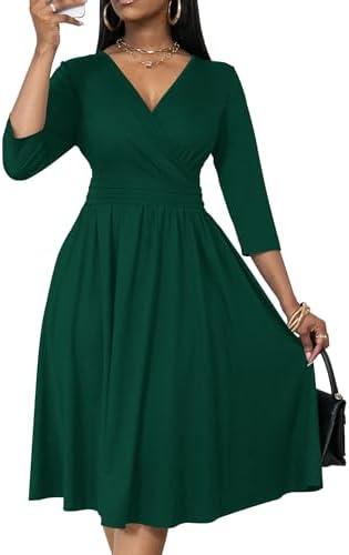 Nmoder Women’s Elegant A-Line V Neck Midi Dress with 3/4 Sleeves and Pockets
