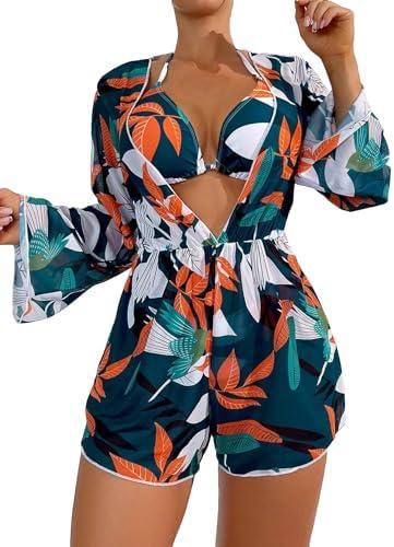 Verdusa Women’s Tropical Print Halter Triangle Bikini Set Swimsuit with Cover Up Romper