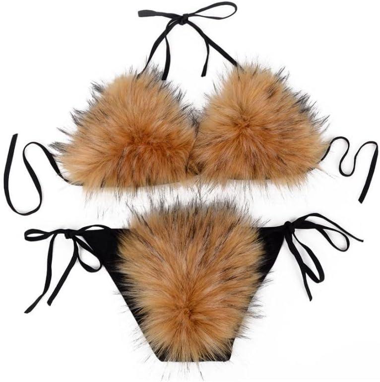 Womens Furry Faux Fur Bikini Sets Two Piece Halter String Triangle Swimsuits Bathing Suit