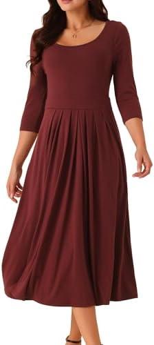 Seta T Women’s 3/4 Sleeve Crewneck Pleated a Line Dresses Swing Casual Maxi Dress with Pockets