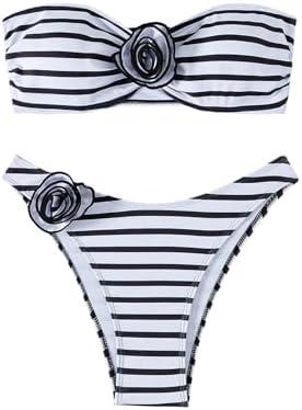This chic two-piece bikini set combines a bandeau top with cheeky bottoms, adorned with a striking flower design that enhances femininity while providing a comfortable fit. The black and white striped pattern adds a modern touch, perfect for sunbathing or swimming. Available in a medium size, it offers excellent support and flexibility thanks to its adjustable elements and well-thought-out design. The material is lightweight and dries quickly, making it ideal for beach days or pool parties.