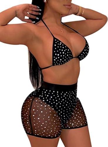 EDITCOZY Women’s Sexy 2 Pieces Outfits Mesh Bikini Top Sparkle Shorts Sets Swimsuits