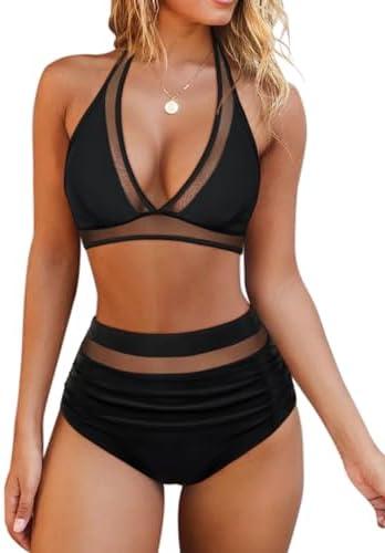 OMKAGI Women Mesh High Waisted Bikini Set Sexy V Neck Tummy Control Swimsuit Bathing Suit
