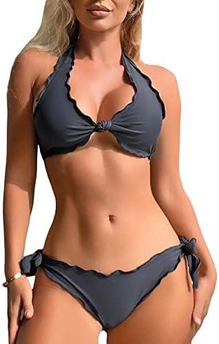 OYOANGLE Women’s 2 Piece Halter Tie Side Bikini Swimsuit Knot Front Lettuce Trim Bathing Suit