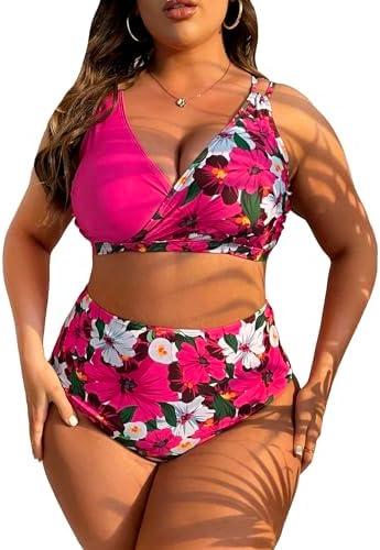 Floerns Women’s Plus Size Bathing Suit Floral Print Asymmetrical Neck Bikini Set