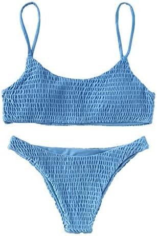 Verdusa Women’s 2 Peices Textured Bathing Suit Smocked Wireless Bikini Bandeau Top Thong Swimsuit