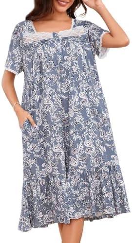 Long Nightgowns for Women Lace Collar Floral Print House Dresses with Pockets S-3XL
