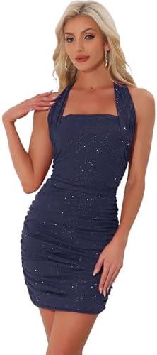 Allegra K Sexy Ruched Bodycon Dress for Women’s Tie Halter Neck Backless Sparkly Party Dress