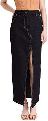 Stylish Long Denim Skirt with Front Slit and Pockets