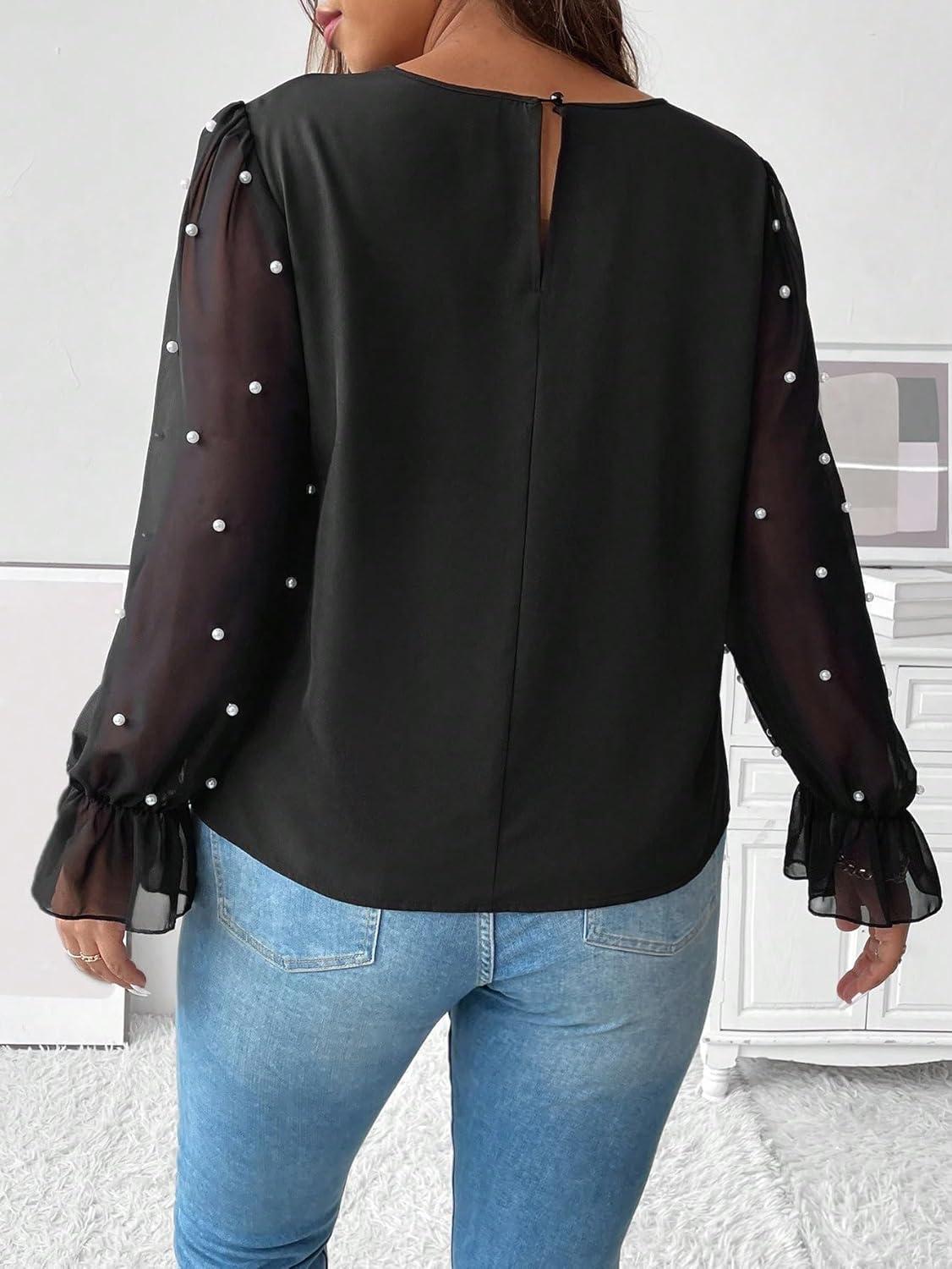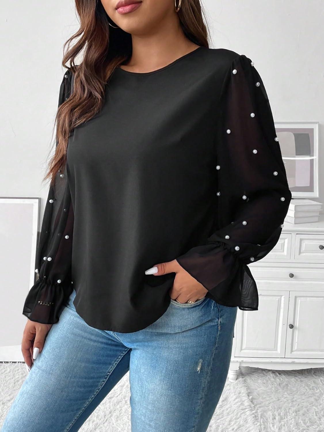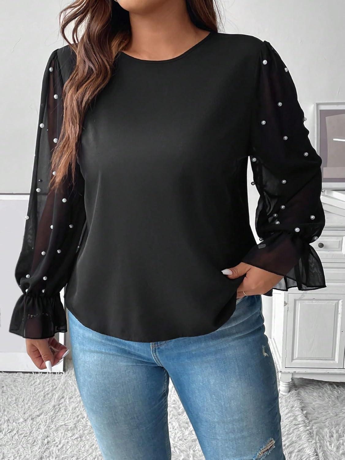 Overview of the Floerns Pearl Beaded Flare Blouse for Plus Sizes
