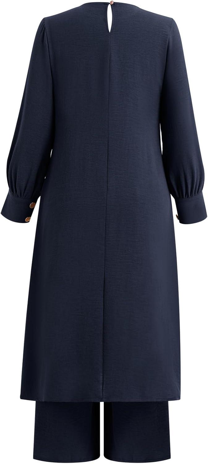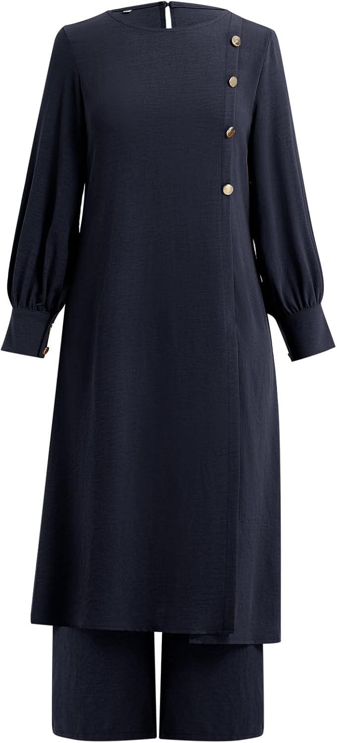 We appreciate the thoughtful combination of traditional modesty and modern style embodied in this set. The long sleeves and round neck maintain a respectful silhouette, while the button decor, split detailing, and clasp closure at the back add subtle yet elegant touches that elevate the overall aesthetic. Its solid color and loose fit offer versatility, making it suitable for various occasions such as Ramadan prayers, casual outings, or Dubai-inspired fashion looks. The elastic waistband on the pants ensures comfort without compromising the modest style this attire promises.