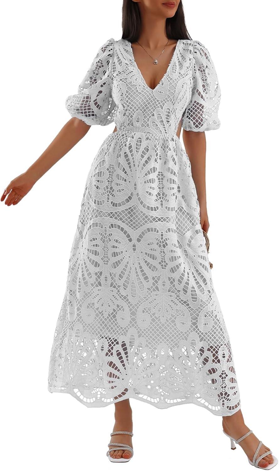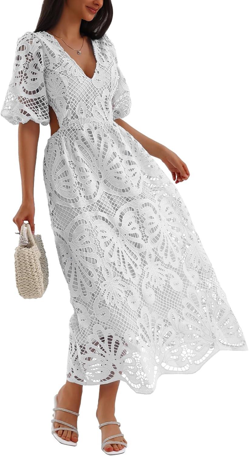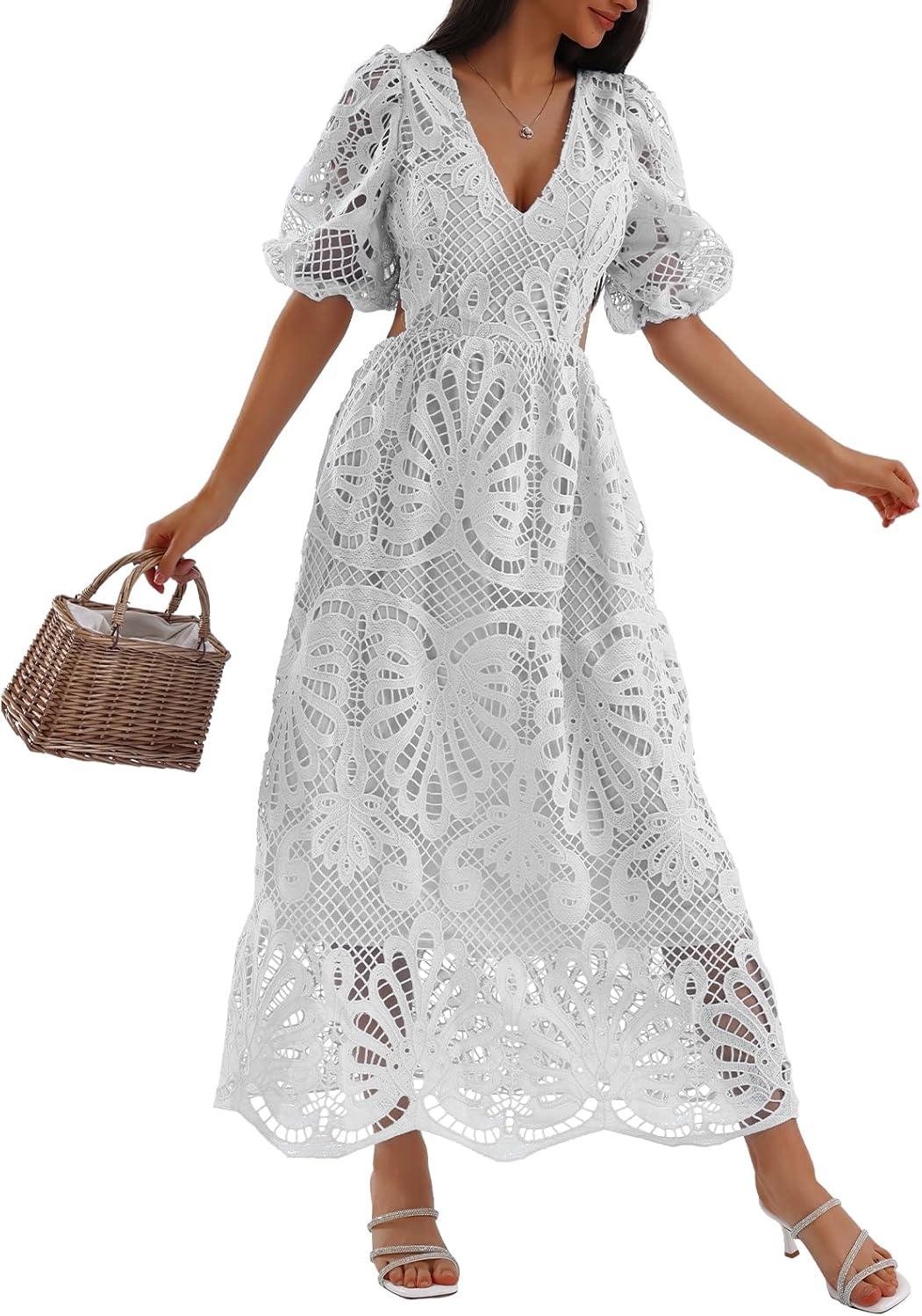 This dress effortlessly bridges the gap between casual comfort and chic elegance, making it an ideal choice for a wide range of summer events. Its puff sleeves and deep V-neck design add a breezy and feminine touch, while the backless hollow lace detailing injects just the right amount of flirtiness. Whether we’re heading to a beach party, a garden wedding, or a casual lunch date, this piece adapts to the mood and setting with ease. The flowy midi length ensures comfort throughout the day, leaving us free to move and mingle without feeling restricted.
