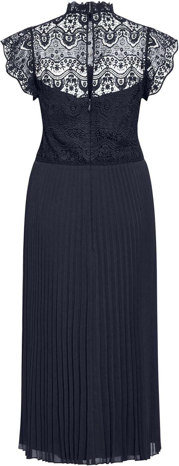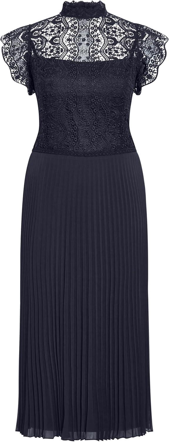 We found this dress to be a stunning blend of delicate textures and elegant design. The flutter lace sleeves add a light, romantic touch while framing the high neck lace overlay beautifully. The broderie lace bodice offers intricate detailing that complements the fitted waistline, creating a flattering silhouette perfect for any special occasion.The skirt’s floaty chiffon fabric,combined with a midi-length pleated hemline,allows graceful movement without losing structure. It’s fully lined, ensuring comfort and coverage as we step thru the evening.