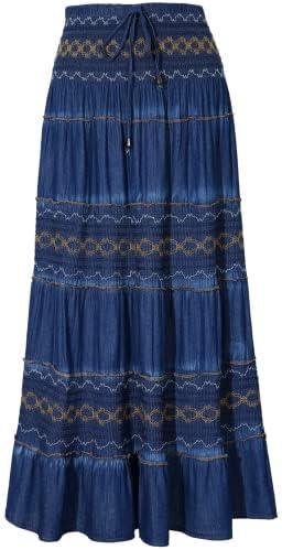 This high-waisted pleated long skirt is made from 100% cotton, ensuring comfort while maintaining a chic denim aesthetic. The lightweight fabric moves easily, distinguishing it from heavier jeans. One of its standout features is the elastic waistband, which provides a snug fit without sacrificing comfort. With its flowy hemline and unique boho embroidery, this skirt is perfect for a casual day out or a more formal occasion. It can be worn in two ways—as a maxi skirt or a tube midi dress—making it a versatile addition to any wardrobe. Pair it effortlessly with a crop top, tank, or cami to create stylish outfits suitable for various occasions like parties, vacations, and daily wear.