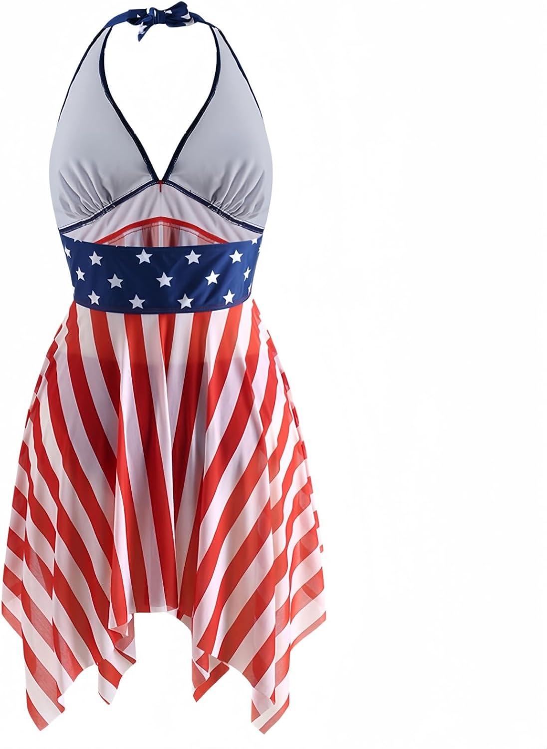 What truly sets this swimsuit apart is its striking American flag stars and stripes print, which offers both a bold statement and a patriotic flair.The design captures the essence of simple yet eye-catching aesthetics, merging vibrant colors with a fresh, natural vibe.The asymmetrical hemline adds a modern twist, creating visual interest and flattering various body shapes beautifully. This combination of classic symbolism and innovative styling ensures that the suit not only stands out on the beach but also celebrates individuality in a unique way.