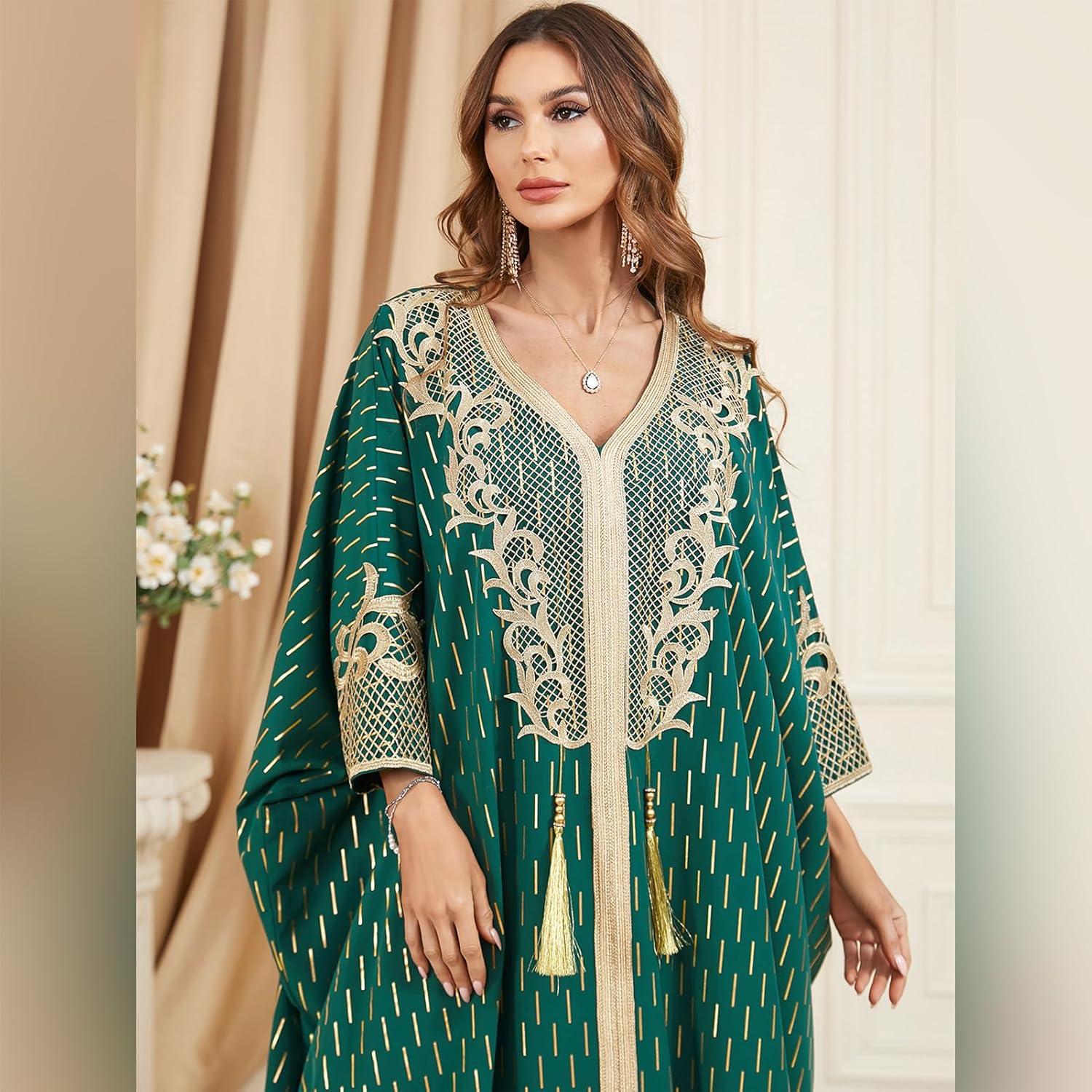 This elegant dress captures the essence of conventional Moroccan design fused with contemporary modest fashion, making it a versatile choice for various occasions such as weddings, Eid celebrations, Ramadan gatherings, or just casual wear. Its one-size-fits-all feature offers a flattering fit for diverse body types, providing comfort without compromising style.The floral batwing silhouette flows gracefully, highlighting an airy, effortless charm that stands out in any setting. Available in multiple vibrant colors, this robe effortlessly blends cultural heritage with modern trends, making it a wardrobe staple for those who appreciate both elegance and ease.