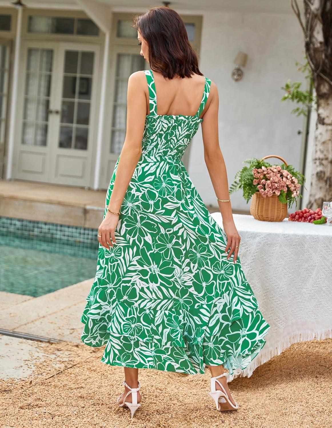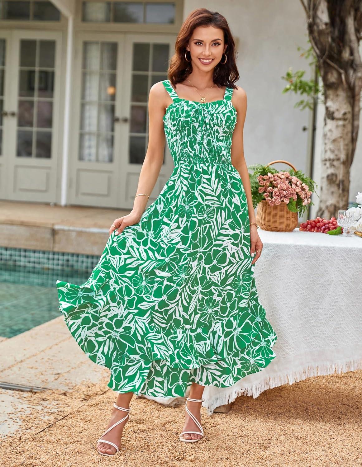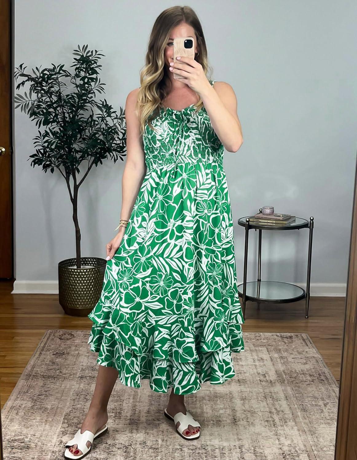 this dress strikes the perfect balance between casual comfort and effortless elegance, making it an essential addition to our summer wardrobe. Its smocked bodice offers a snug yet breathable fit, while the multiple layered, flowy skirt captures that signature boho vibe. Whether we’re enjoying a barefoot walk on the beach, attending a sunlit picnic, or simply strolling down the street, it adapts seamlessly. Pairing it with sandals and a wide-brim hat elevates the look, while heels can easily transform it for more dressy occasions. the floral print adds a timeless charm, ensuring we stay stylish without sacrificing comfort.