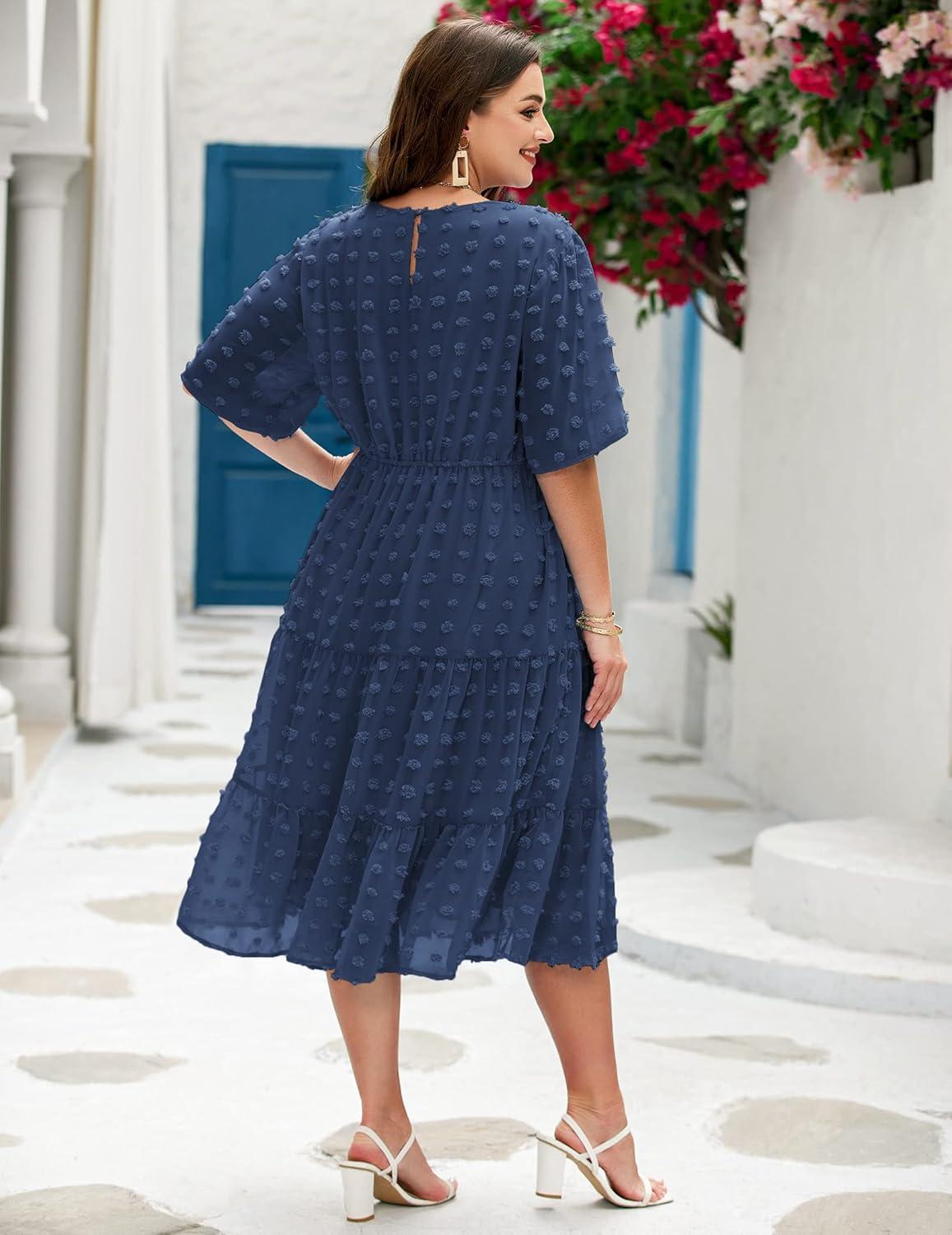 We found this midi dress to be incredibly adaptable, striking the perfect balance between casual comfort and summer elegance.The lightweight chiffon fabric with delicate swiss dots adds a whimsical charm that effortlessly complements a variety of occasions – from laid-back beach strolls to casual brunches or even semi-formal summer gatherings. Its soft A-line silhouette flatters our curves without feeling restrictive, making it a go-to piece for warm days when we want to look polished yet stay cool. The round neck and short sleeves enhance its breezy vibe, allowing us to style it simply with sandals or elevate it with accessories for a night out.