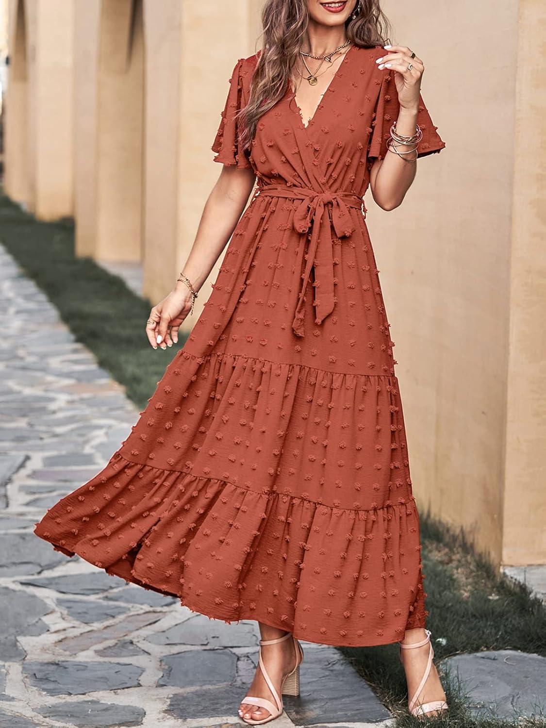 as we wrap up our look at the MASCOMODA Womens Summer Swiss Dot Maxi Dress, it’s clear this flowy, boho-inspired piece blends comfort and style effortlessly. Whether you’re attending a wedding, heading to a casual brunch, or enjoying a day at the beach, this dress adapts to every occasion with its flattering wrap design, delicate Swiss dot pattern, and flutter sleeves. We appreciate how the self-tie belt and elastic waist lend a customizable fit, while the tiered, ankle-length silhouette adds just the right amount of movement and grace.