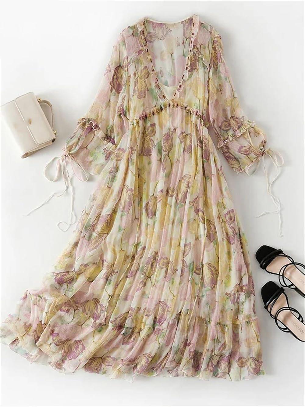 Worn across mornings ​and slow afternoons, the 100% Mulberry Silk​ Ruffle Dresses for⁢ Women⁤ V Neck Print Maxi Dress 3/4‍ Sleeves Beach Long Dresses gradually softens into the wardrobe, less‌ an occasion piece⁤ and more an available option. ‍In daily wear the silk breathes ⁤and eases around movement, and small changes in the​ fabric show up not as loss but ​as a quiet patina to how it⁤ feels against the skin. As ⁣it’s worn through‌ regular routines,‌ pulling​ the dress from the hanger becomes part of habit,‍ a familiar motion that marks ordinary mornings. Over time it settles into the rotation.