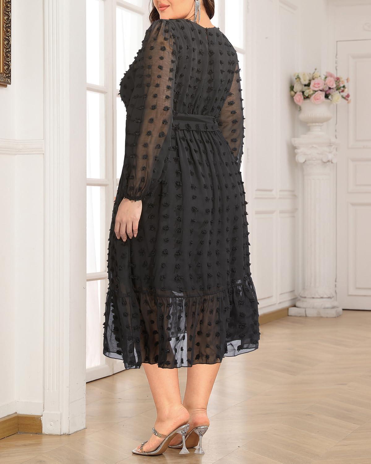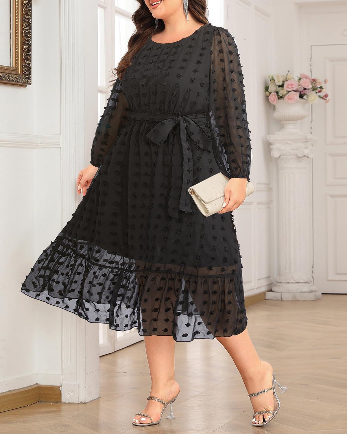 the Swiss dot fabric used in this dress brings an enchanting texture that effortlessly elevates any semi-formal occasion. Its subtle, raised polka dot pattern is both charming and timeless, adding delicate visual interest without overwhelming the overall look.We found that the fabric’s lightweight chiffon drapes gracefully, creating a soft flow that perfectly complements the belted A-line silhouette. This combination not only highlights the waistline but also flatters a variety of body shapes, making it an ideal choice for plus-size spring and fall events.