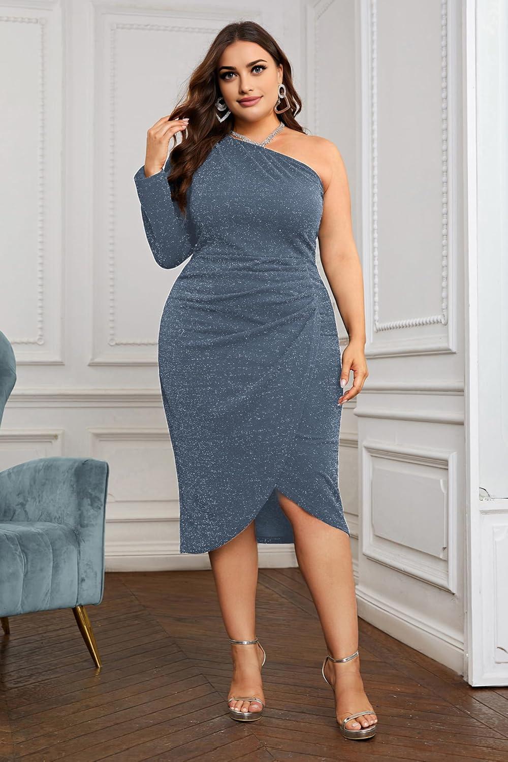 from the moment we slipped into this glittery midi dress, it was clear this design was thoughtfully crafted for plus size figures. The one-shoulder silhouette, paired with elegant ruching and a subtle wrap effect, created a flattering hourglass shape without feeling restrictive. The sparkly fabric caught the light beautifully,making it an ideal choice for cocktail parties,weddings,or any event where standing out is the goal. Despite its glamorous look, the dress was surprisingly comfortable thanks to the polyester-spandex blend, allowing for easy movement throughout the evening. Whether we were dancing or mingling,the midi length provided excellent coverage while maintaining a sleek,bodycon fit.
