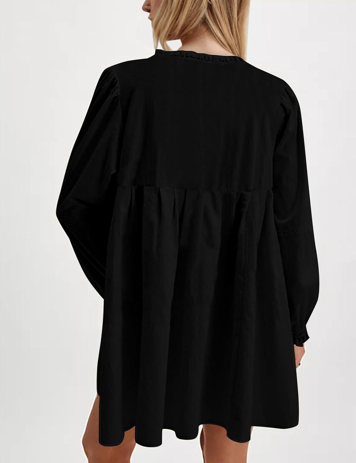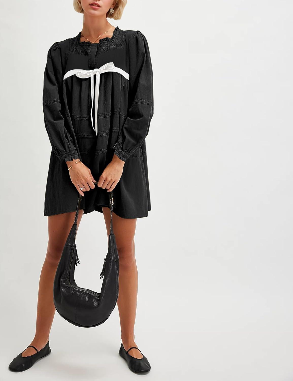 Over time the Women Flowy Long Puff Sleeve Mini Dress Casual Bow Tie Front A-line Tunic Dress Lace Embroidered Babydoll Dress Black stops feeling like a statement and starts feeling like a familiar choice in your closet.In daily wear you notice the fabric settling — softening where you touch it most — and the comfort behavior becomes the quiet reason you reach for it. As it’s worn in regular routines small signs of aging appear, a softened trim or a little give at the seams, and those details fold into the background of getting dressed. Eventually it simply settles.