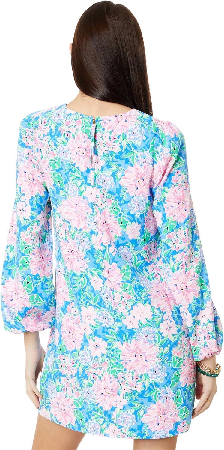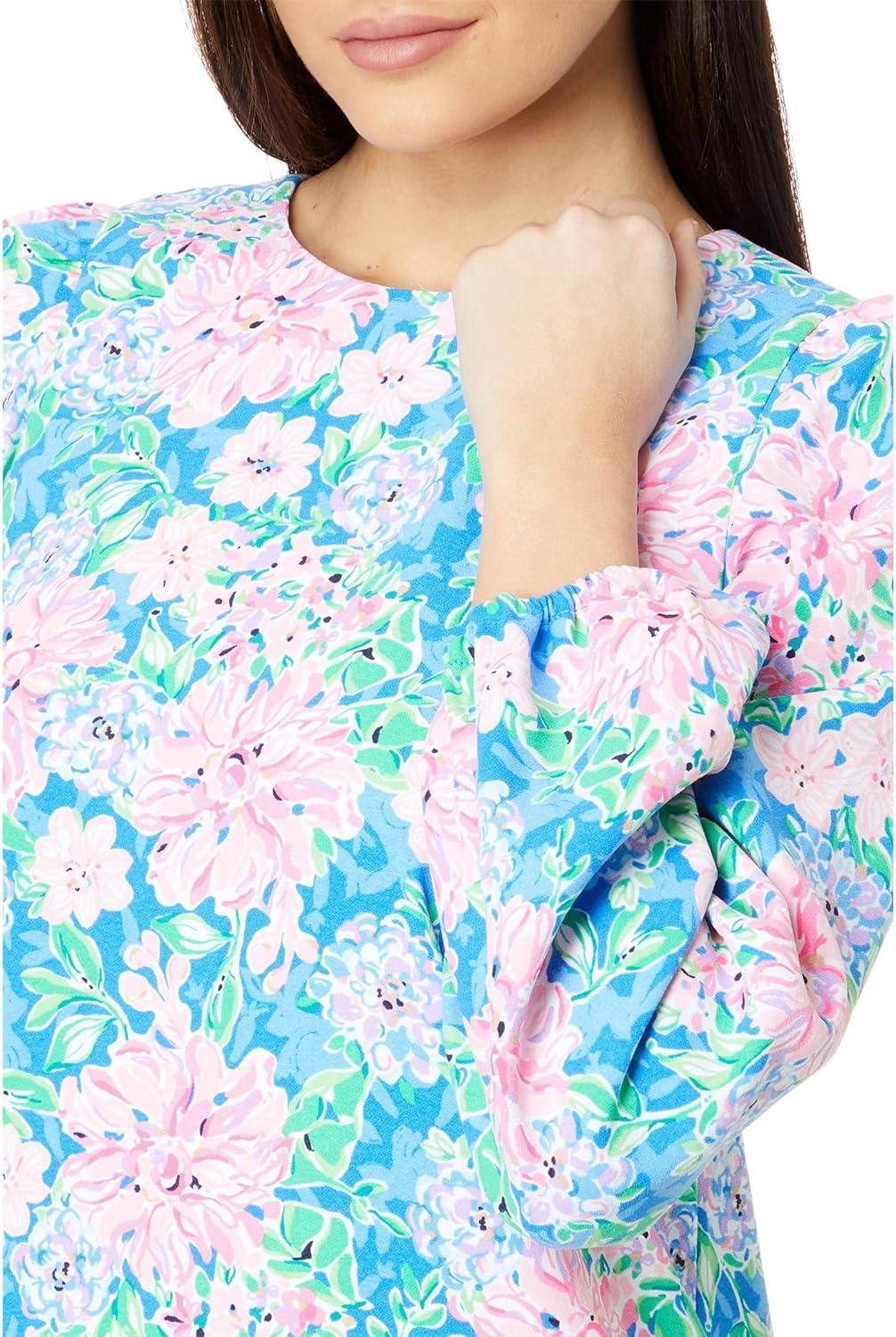 The first thing you notice sliding into the Lilly Pulitzer Alyna dress is the fabric’s weight—considerable enough to settle without clinging, yet soft and cool against your skin. The sleeves fall smooth along your arms and the shoulder seams sit quietly where they should, while the straight cut skims your frame rather than skimming out. As you walk, the hem drops in a steady, unflappable line; when you sit, the front smooths into broad folds rather of pinching. In that first light the dress feels composed, the material carrying a calm visual weight that lets the silhouette read as measured and lived-in rather than overly structured.