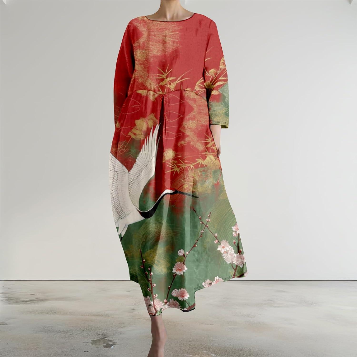 You slip into the MARSVOVO Long Flowy Dress — the flowered, boho summer piece on the tag — and the fabric greets your skin with a cool, slightly textured hand that warms as you move. it drapes low and easy, skimming across your hips rather than clinging, the pleats opening into a soft arc when you turn so the skirt swings with a measured, gentle momentum. The dress feels lighter than it looks on the hanger but has enough body to hold a modest silhouette; seams lie flat and the three-quarter sleeves brush your forearms without tugging when you reach or sit. Those first few steps and a quick fold of the knee reveal how it settles and recovers — a lived-in calm rather than anything stiff or floaty.