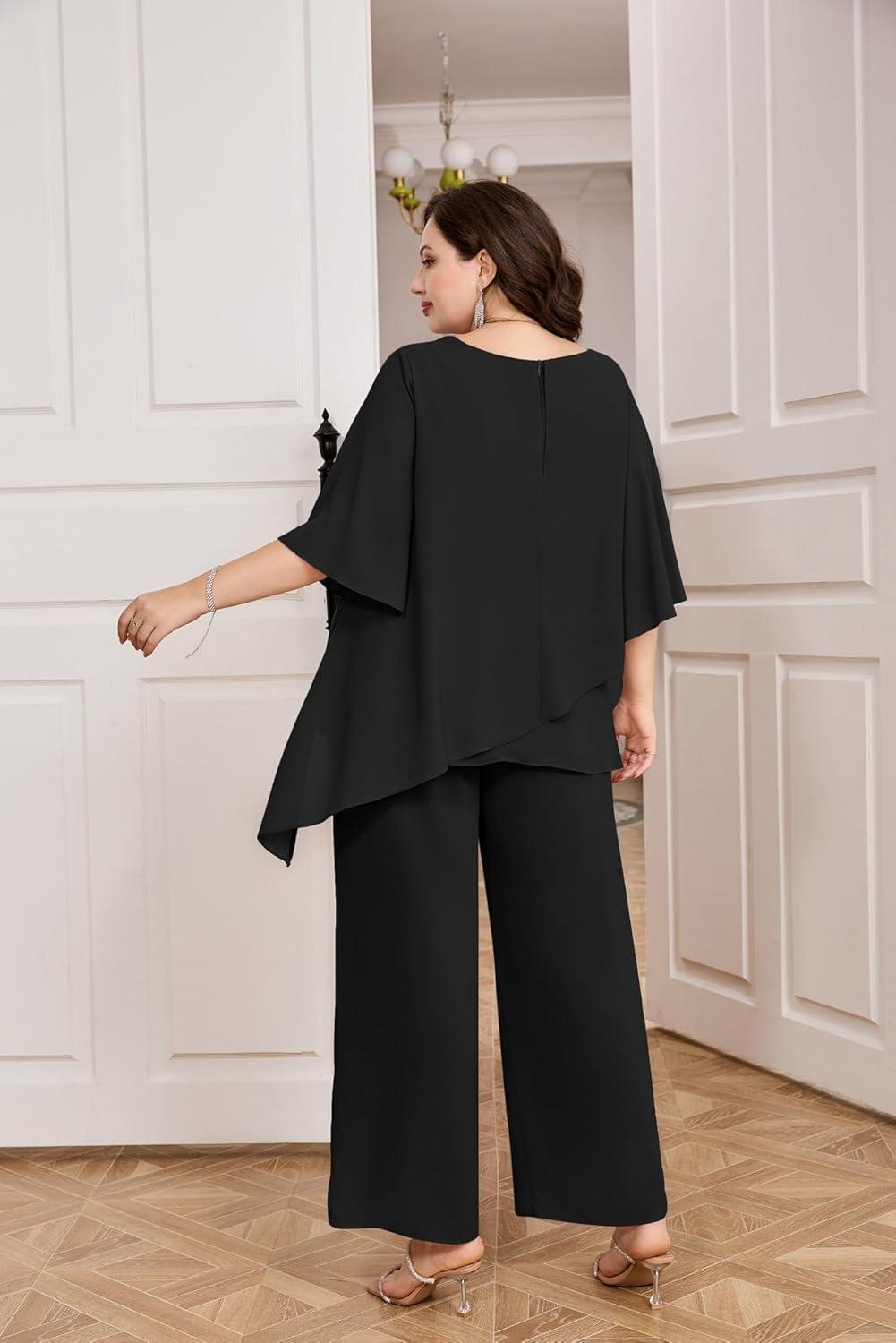 Designed with elegance and comfort in mind, this two-piece ensemble perfectly complements the special occasions that require a refined yet flattering silhouette. Crafted from lightweight chiffon, the outfit features asymmetrical ruffle layers that add a graceful flow to each movement, enhancing the overall look without compromising ease of wear.The cape sleeves provide a modern twist to the traditional pant suit, offering both coverage and style.Available in multiple colors and sizes, it caters specifically to plus size women, ensuring a tailored fit that celebrates curves beautifully.
