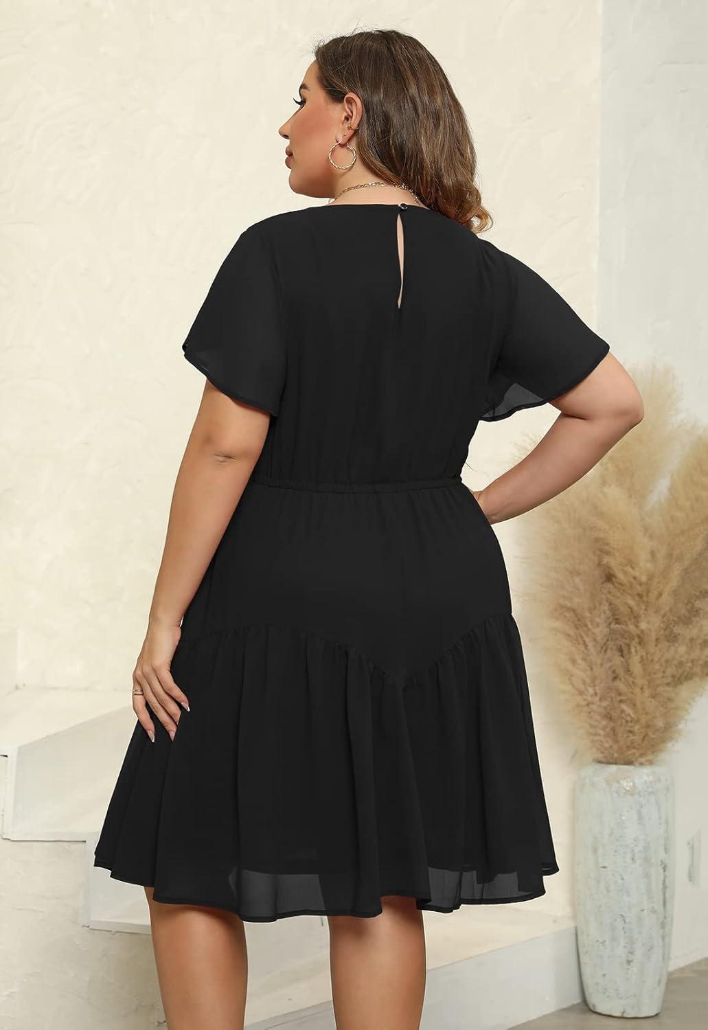 Upon first encounter, this dress impresses with its effortless blend of comfort and style, crafted thoughtfully for curvier figures. The empire waistline subtly accentuates our shape while the stretchy chiffon fabric ensures ease of movement without feeling restrictive. The scoop neckline provides just the right amount of coverage, making it suitable for various occasions. One of our favorite design touches is the ruffle sleeves, which add a delicate, flowy femininity and make the whole look feel light and breezy-perfect for warm summer days or layered styling in cooler weather.