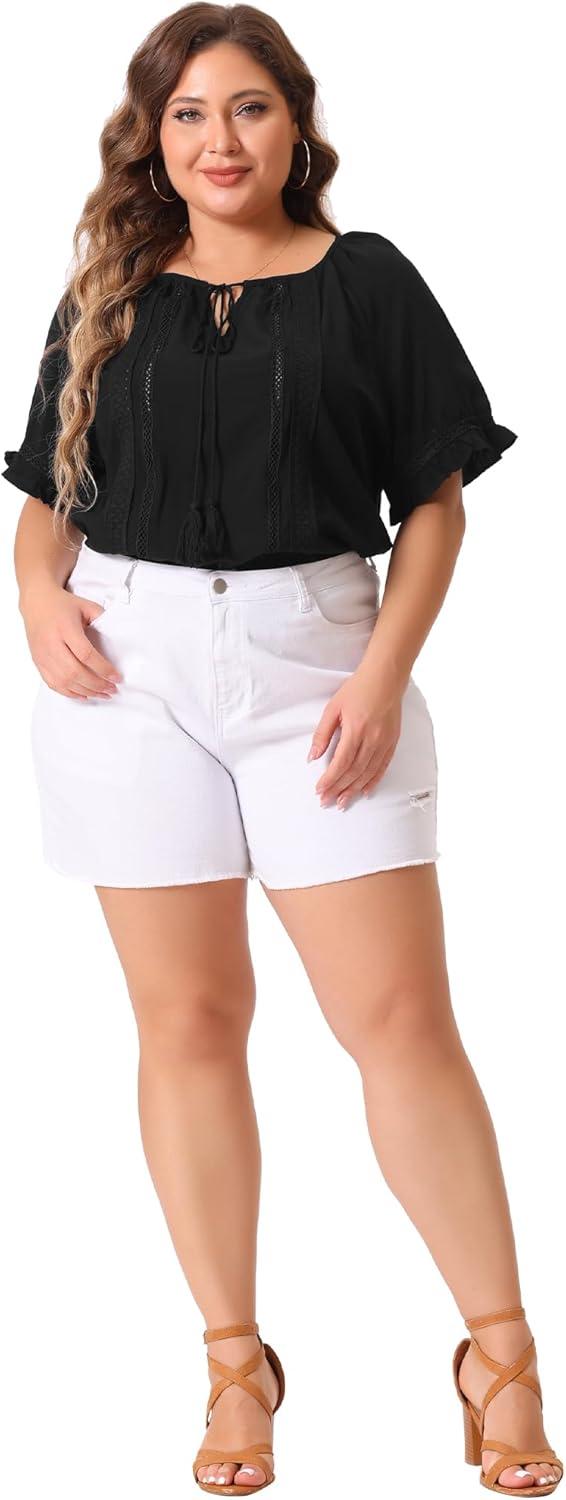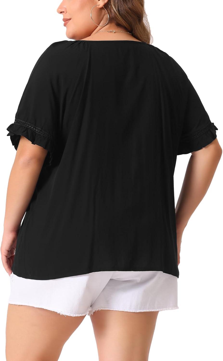 The delicate ruffle short sleeves bring a playful and feminine touch that makes summer outfits instantly more charming. These soft,flowing sleeves offer just the right amount of flair without overwhelming the silhouette,allowing for comfortable breathability on warm days. The crochet lace detailing paired with a subtle tie neck design elevates the blouse from simple casual to a piece that exudes effortless elegance. For those of us who appreciate thoughtful design in plus-size clothing, this top stands out with its flattering fit and summery vibe that balances style and comfort seamlessly.