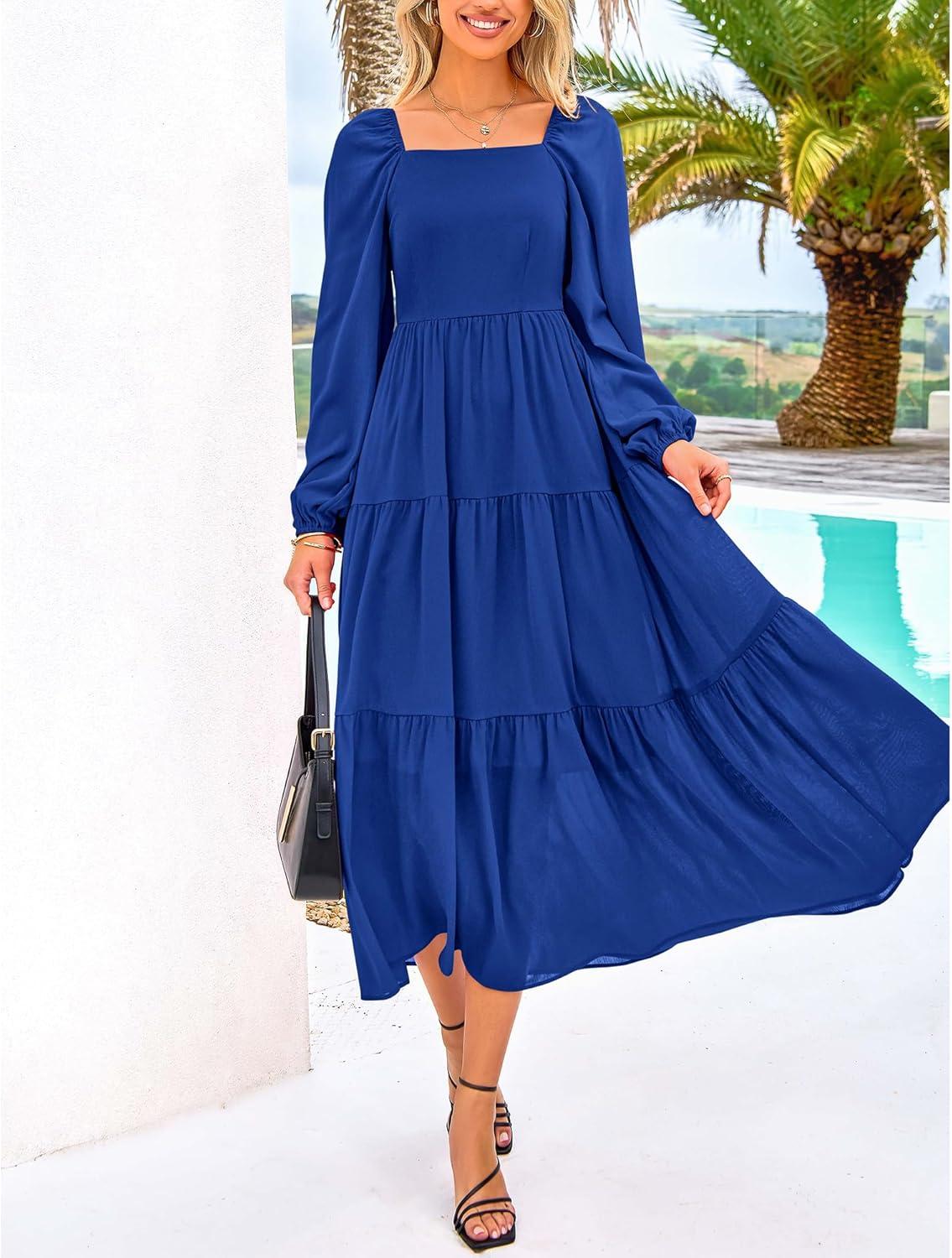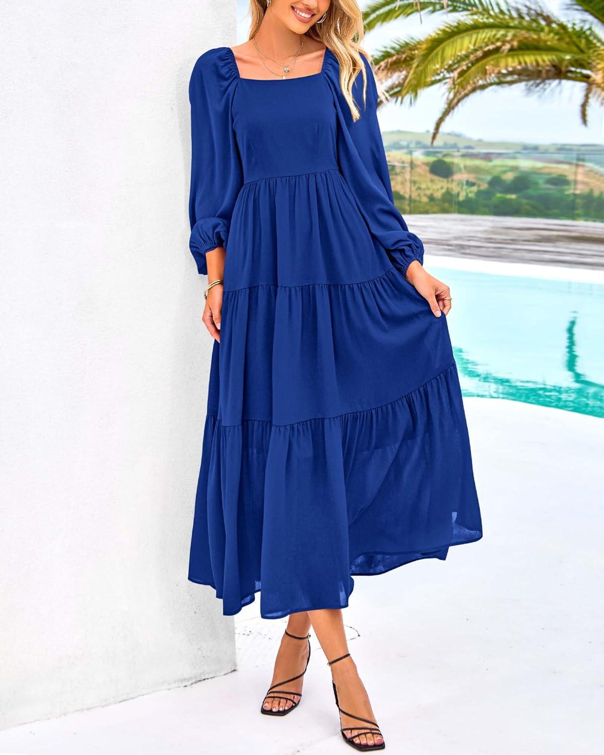 The material of this dress strikes a perfect balance between elegance and comfort, making it an excellent choice for formal occasions. Crafted from a lightweight, flowy fabric, it gracefully drapes over the body, enhancing the tiered maxi silhouette without appearing bulky. The smocked back adds flexibility for a flattering fit, while the square neckline and puff long sleeves complete the sophisticated look. additionally, the presence of elastic cuffs contributes subtle structure to the sleeves, elevating the overall polished feel. This combination of thoughtful design elements and high-quality material makes the dress highly suitable for weddings,cocktail parties,and even office events that require a formal dress code.
