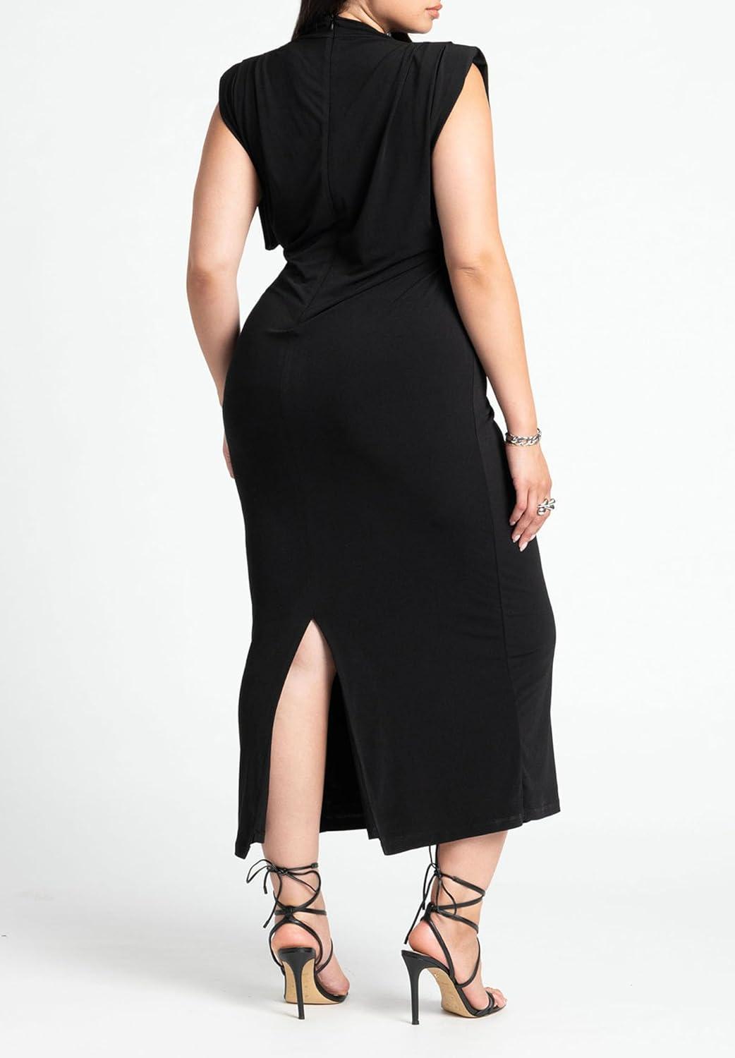 This midi dress offers a sleek and modern silhouette, featuring a sculpted mock-neck design that gracefully frames the neckline while strong shoulder detailing adds a tailored edge. The clean back slit enhances movement without compromising its polished appearance, making it an ideal choice for both casual and semi-formal occasions. Crafted too contour and flatter plus-size figures,this piece balances comfort with sophistication,suggesting a thoughtful design that aligns with current fashion trends.