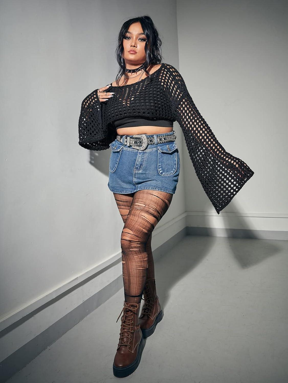 On first sight, this cropped sweater truly stands out with its delicate crochet design and boat neckline that adds a subtle touch of sophistication. The long bell sleeves contribute an elegant flair, making it perfect for both casual outings and more styled looks. Designed with plus sizes in mind, the fit is comfortably roomy without sacrificing shape, which we found to be a great balance between style and comfort. Its lightweight fabric feels breathable yet cozy,ideal for transitional weather or layering. The hollow-out detailing provides just enough ventilation, making it a versatile choice throughout the seasons.