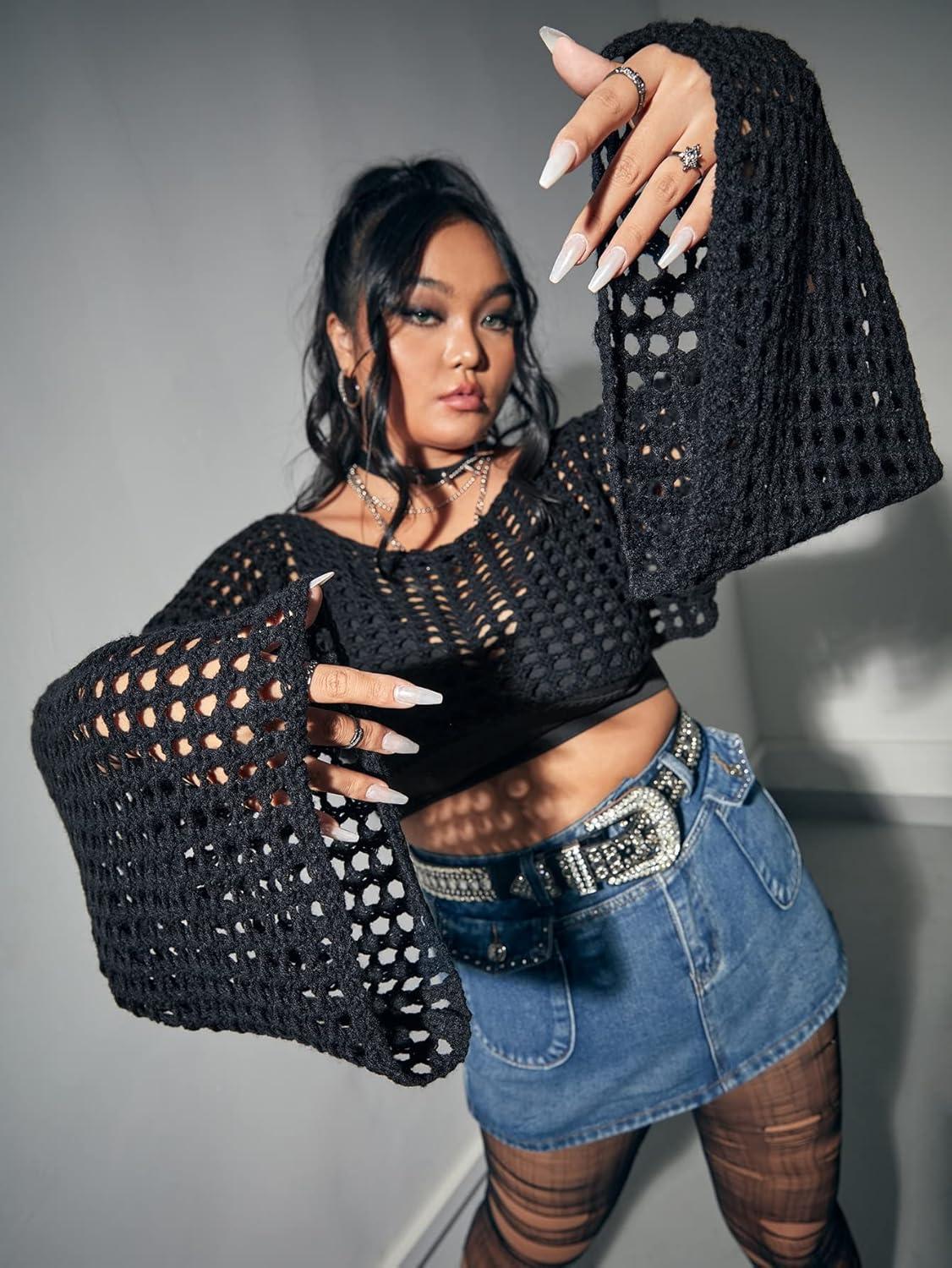 When it comes to fit, this long sleeve cropped sweater truly embraces our curves with a flattering boat neckline and a comfortable stretch that accommodates plus-size frames without feeling restrictive. The cropped length paired with the bell sleeves adds a modern, stylish touch while allowing ease of movement.we noticed it comfortably fits true to size, with just enough room to layer underneath if needed, making it versatile for different body shapes and seasonal wear. The hollow-out crochet detailing provides breathability, ensuring that even with long sleeves, the sweater doesn’t overheat.