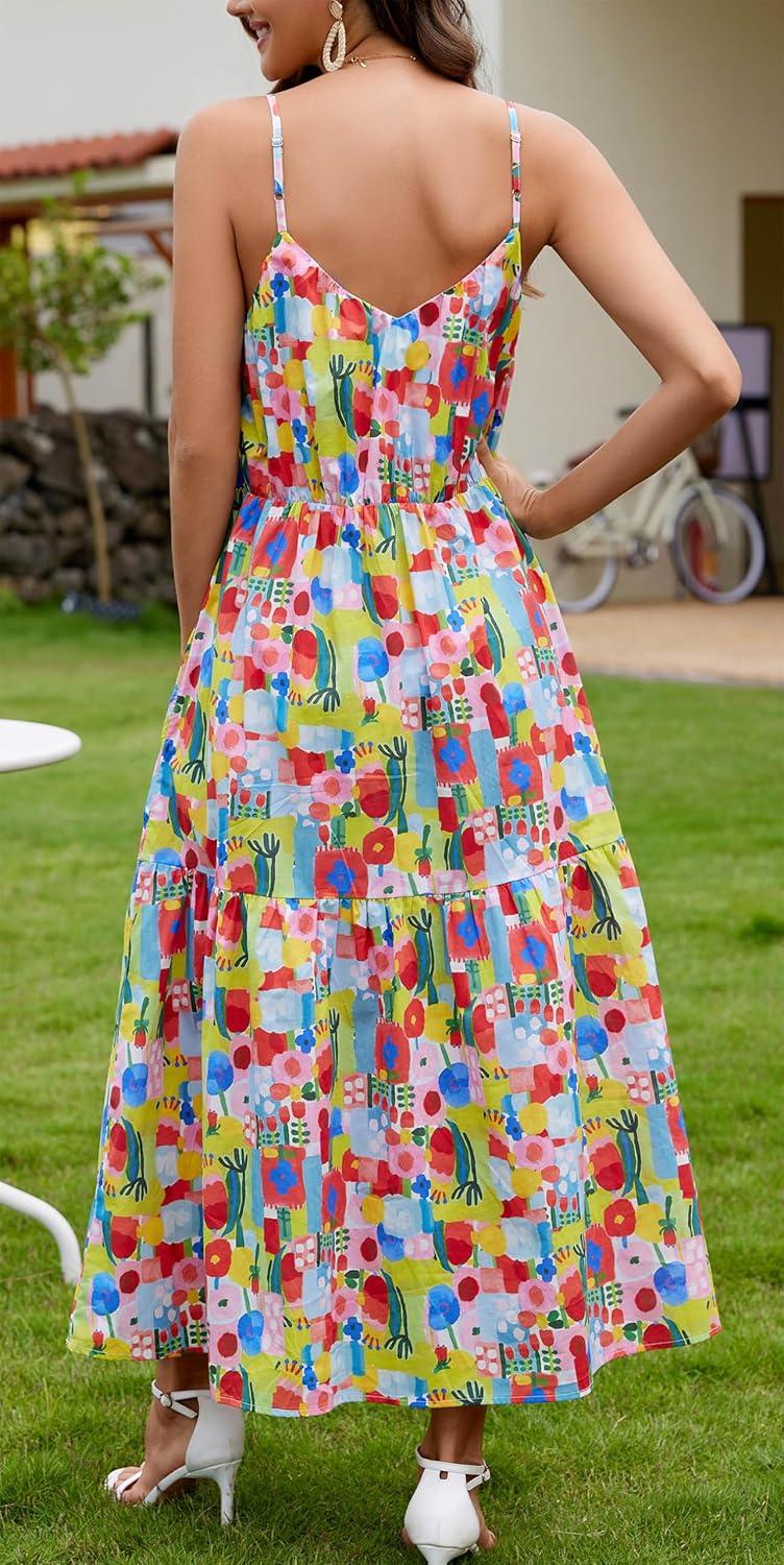 The palette options are equally delightful, ranging from bright florals that pop under the summer sun to more muted, vintage-inspired tones for a subtler statement. this range lets us express our style freely, whether we’re attending a laid-back beach party or a casual office gathering. The spaghetti strap and V-neckline emphasize the dress’s breezy, summery spirit, making the colorful patterns shine even more. We especially appreciate the dress’s pockets, which add practicality while keeping the aesthetic intact-perfect for carrying essentials without disrupting the flow of the florals.