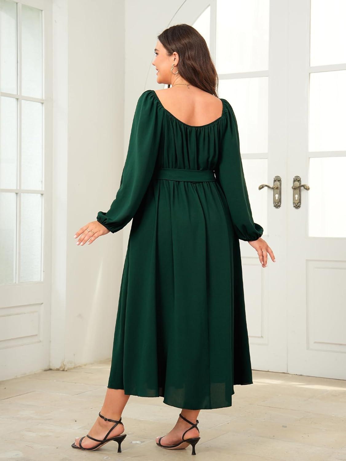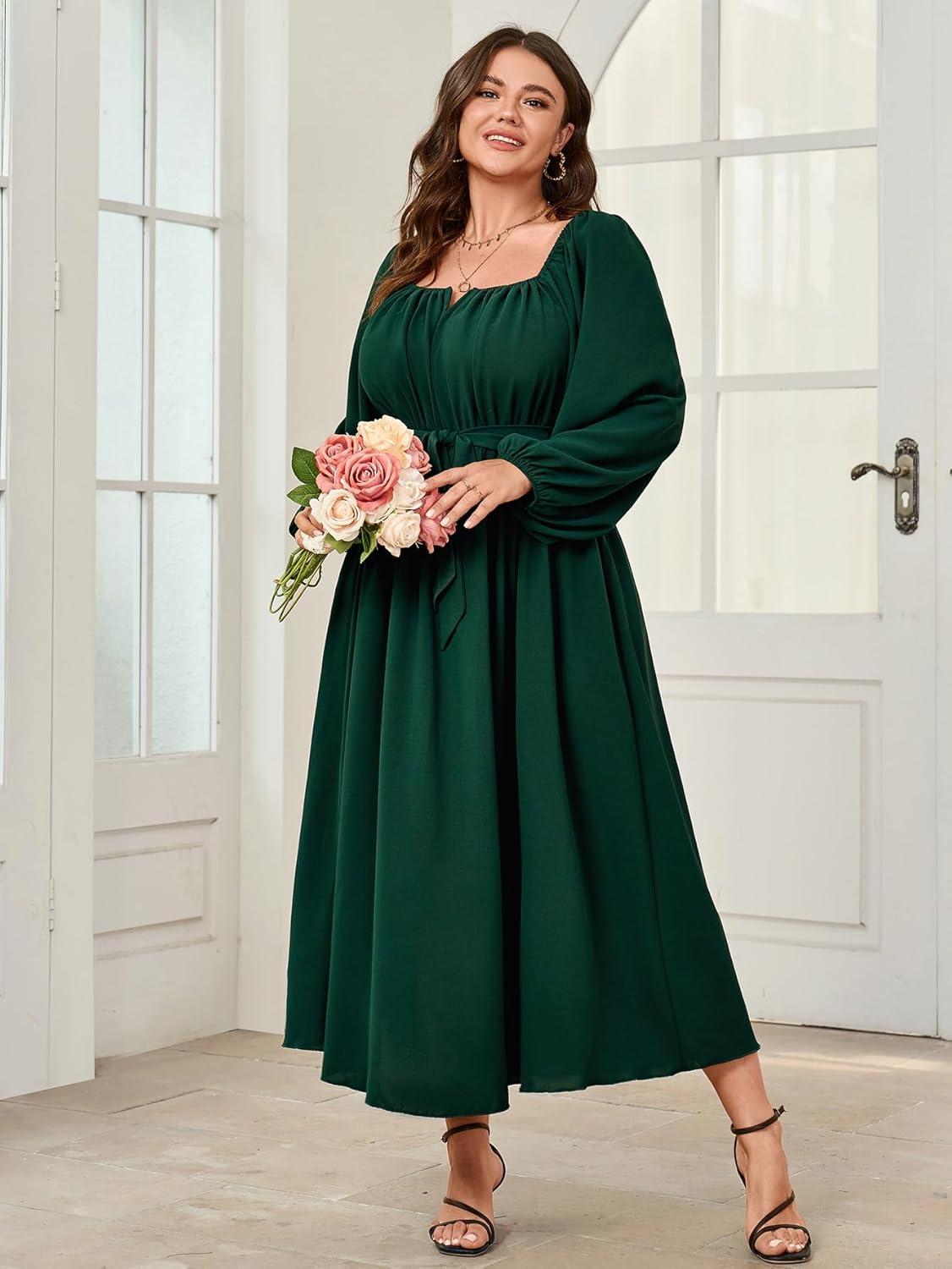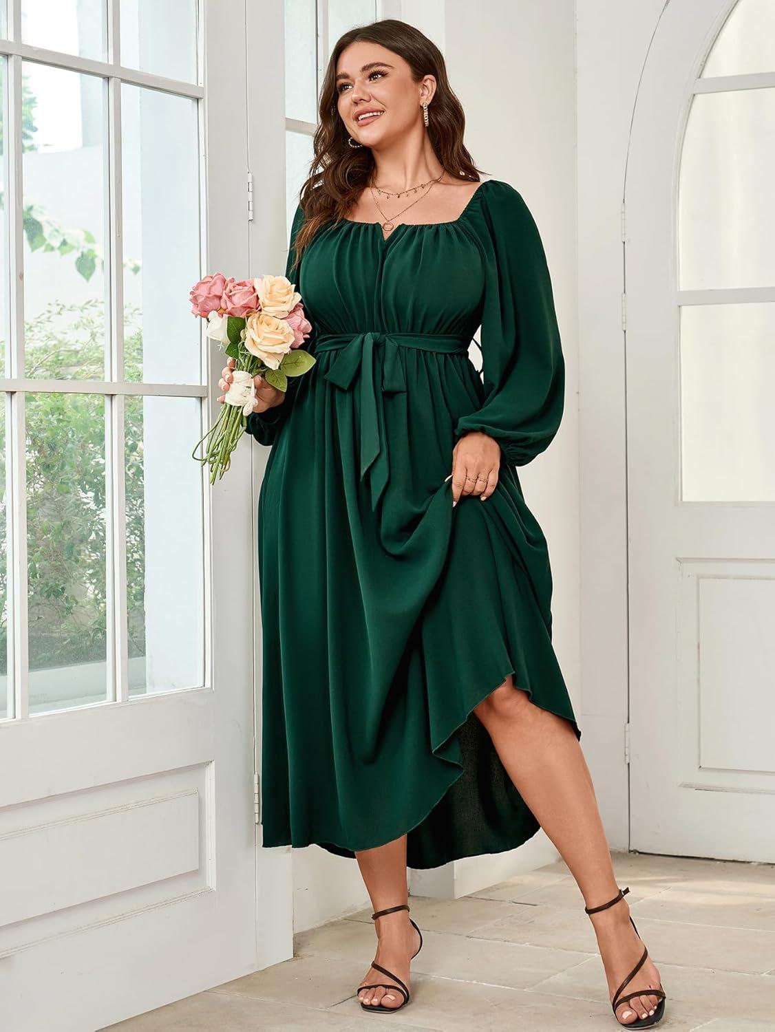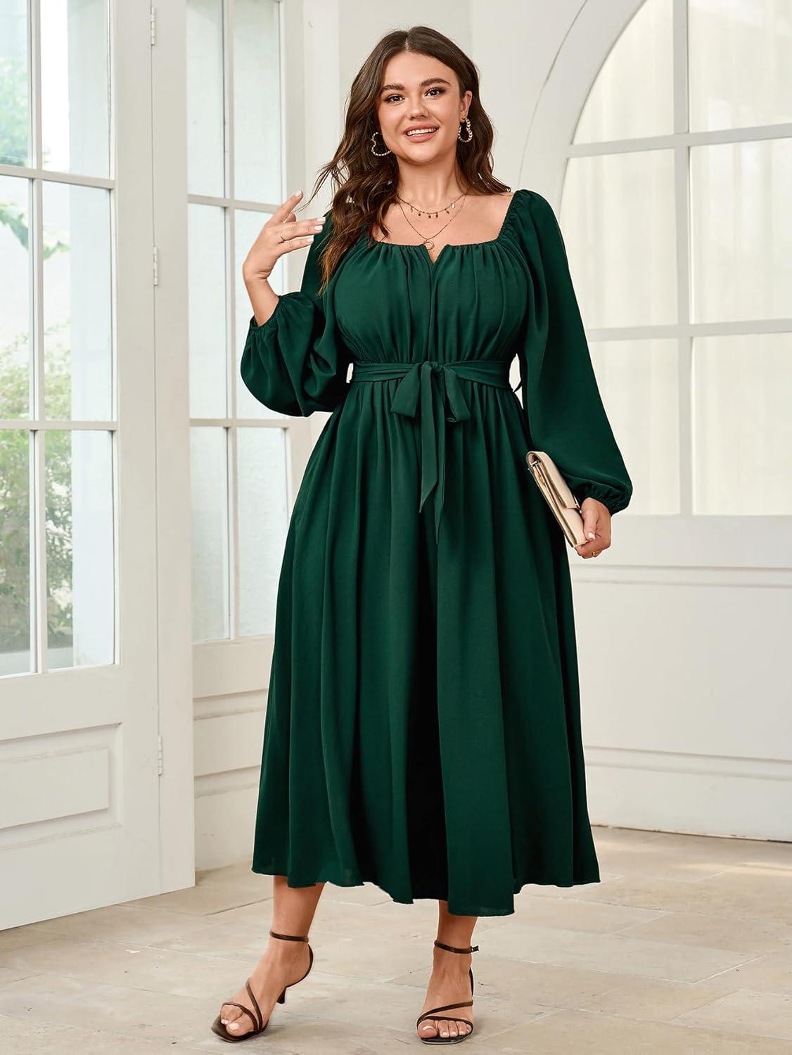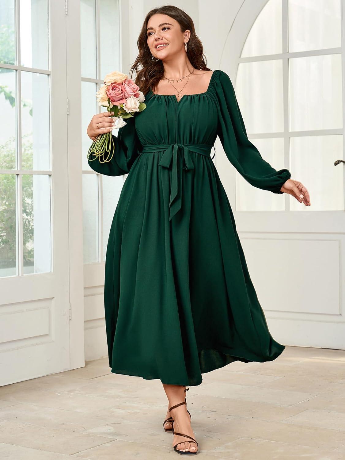 this dress strikes a marvelous balance between elegance and comfort, making it an excellent addition to any plus-size wardrobe. Its long sleeves and elastic square neckline create a flattering silhouette, while the belted waist enhances your natural curves with a stylish tie that adds definition without sacrificing ease of movement. The flowy A-line cut ensures a graceful fall, perfect for occasions ranging from weddings and cocktail parties to more casual daily wear. Pairing it with ankle heels and delicate jewelry elevates the look for formal events, whereas sneakers and a chic handbag make it suitable for a relaxed, everyday vibe.