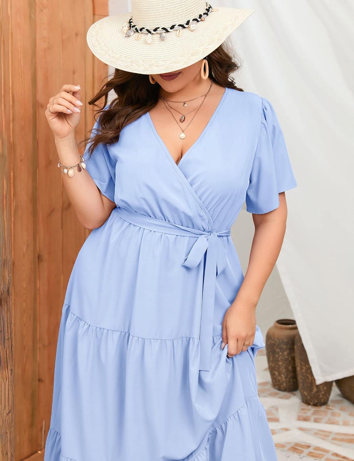 Our first impressions revolve around the flattering fit and notable comfort this dress offers.Designed as a pull-over that mimics wrap styling, it features a true-to-size cut that we found very accommodating across plus sizes XL to 5XL.The high waist design skillfully sculpts a gorgeous silhouette, accentuating curves while providing ease of movement. We appreciated how the ruffle details add a touch of elegance to casual summer wear, effortlessly elevating an everyday outfit without feeling overdone. The lightweight, breathable fabric feels soft to the touch and drapes nicely, making it ideal for warm weather.