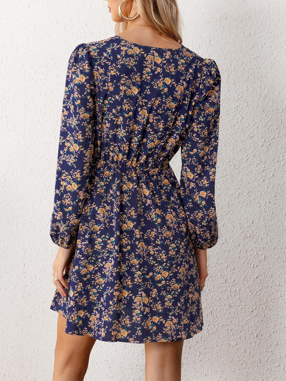 After trying on this dress, we noticed that the fit leans toward a comfortable, slightly flowy silhouette, especially around the waist, thanks to the elastic band that adapts well to various body shapes. The surplice V-neck and long peasant sleeves add a relaxed elegance, while the mini skirt length hits just right above the knee, making it perfect for casual outings or holiday vibes. We recommend sizing according to your usual choice, but for those between sizes, the elastic waist provides enough flexibility to consider sizing down if you prefer a more fitted look. The ruffles and floral pattern create a flattering volume without overwhelming, which means it complements both petite and curvier frames beautifully.