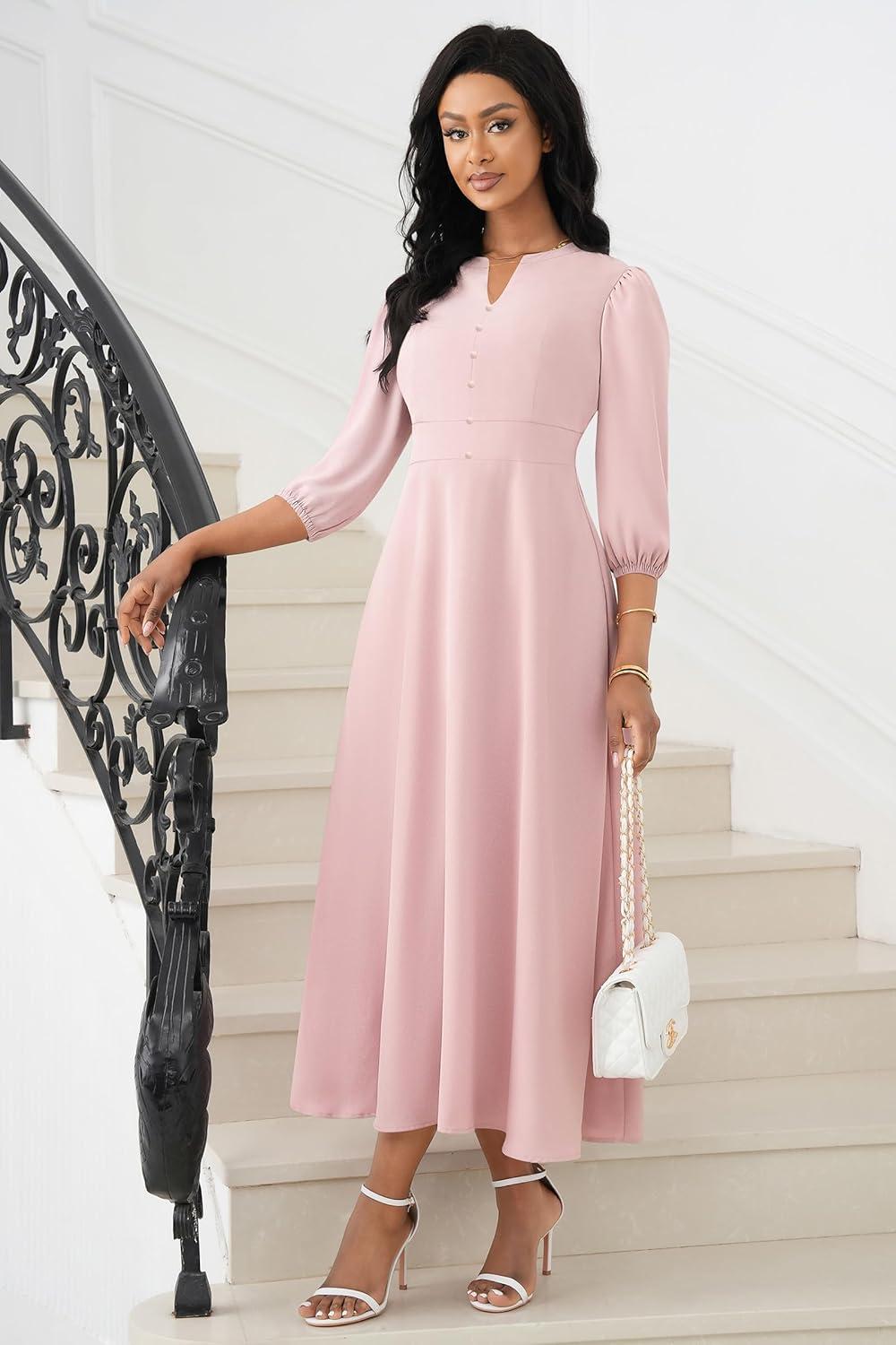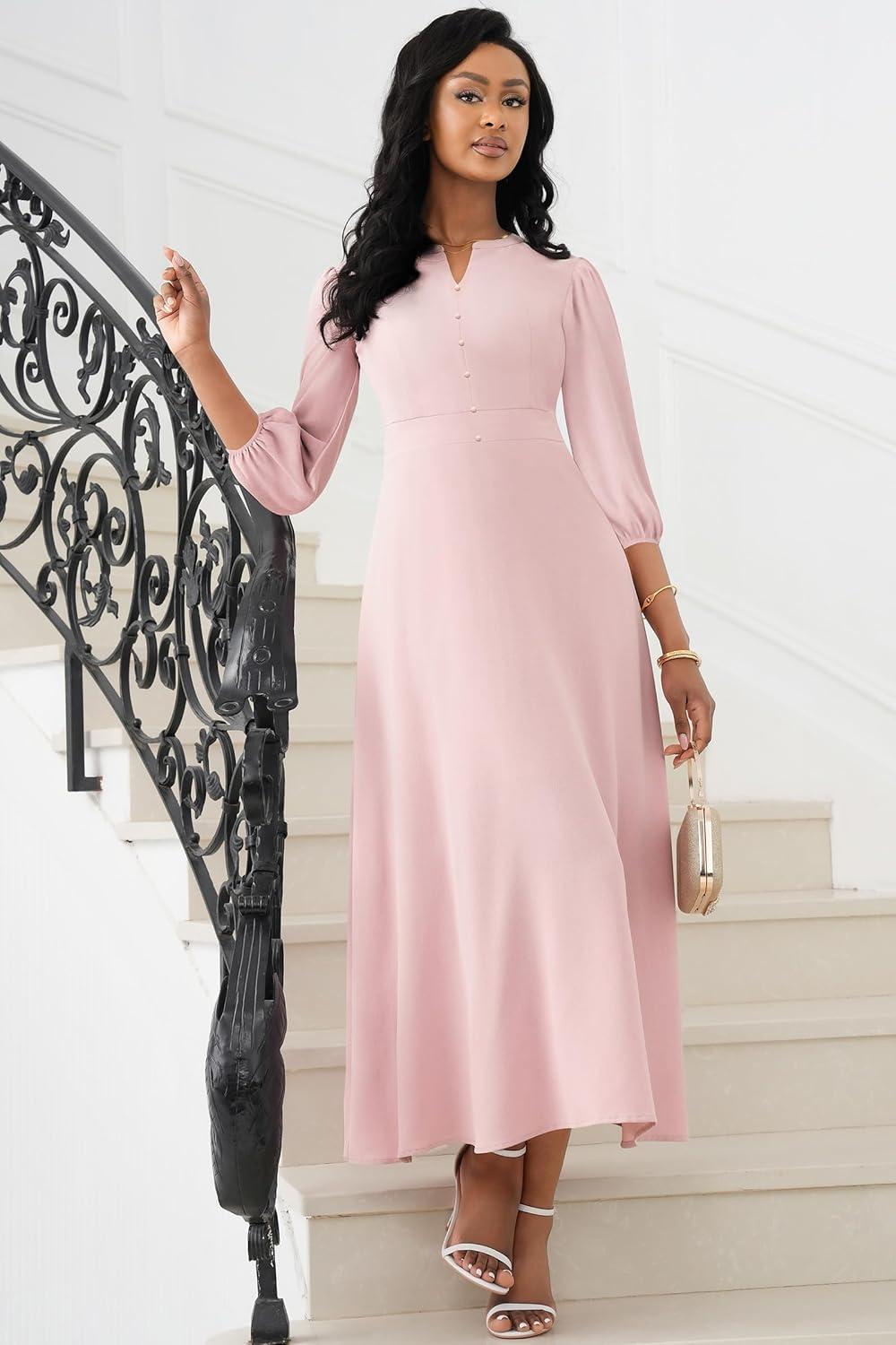 This dress stands out as a versatile choice, perfectly suited for wedding guests who want to blend elegance with comfort. The 3/4 sleeves gracefully flatter the arms, while the A-line high waist design subtly conceals any belly concerns, creating a flattering silhouette for various body types. Its flowing maxi length adds a gentle swing with each step, infusing a sense of effortless movement that enhances your presence at any semi-formal occasion. Crafted with attention to detail and quality, it promises durability that will serve you well beyond just one event, making it a smart addition to your wardrobe.