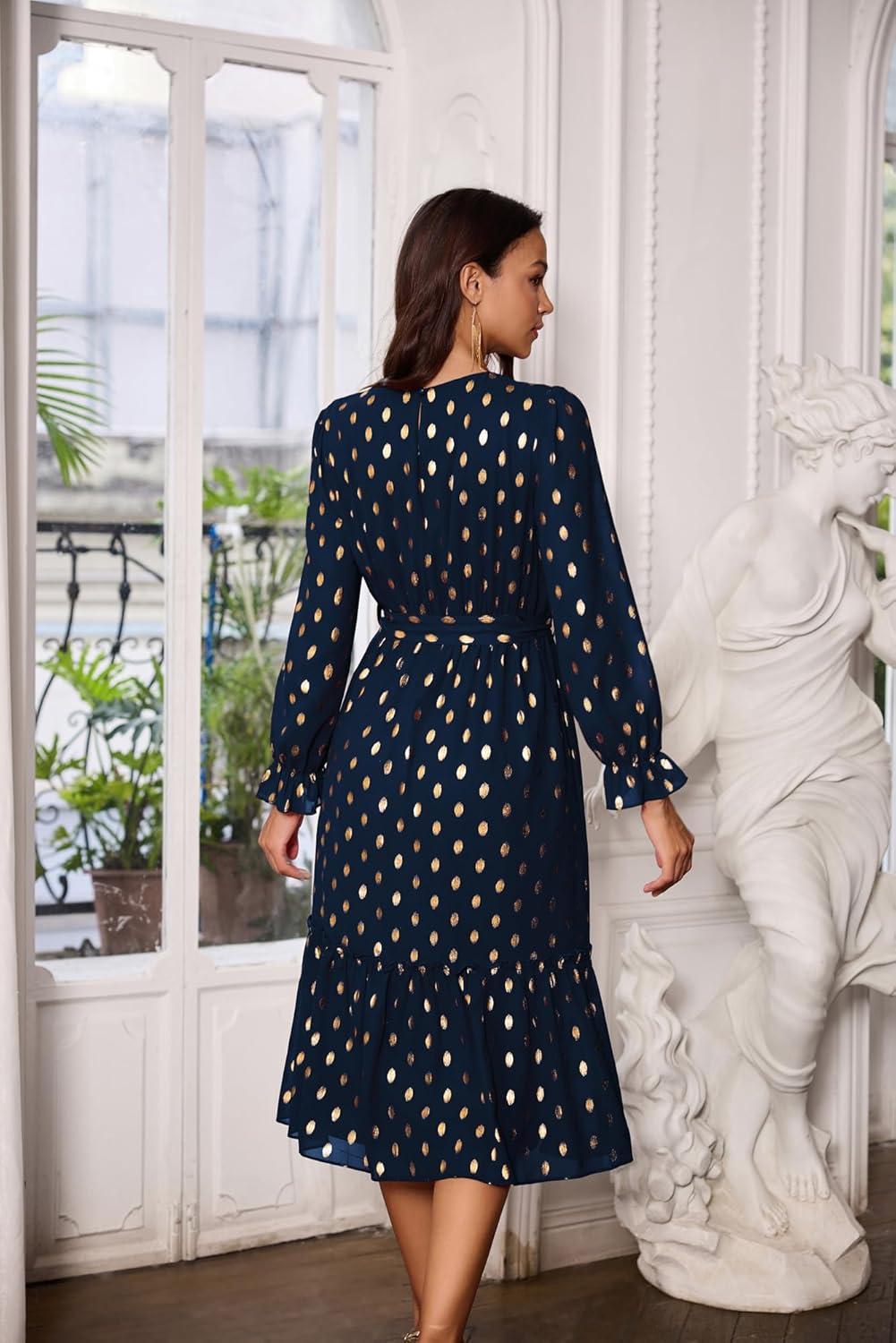 From the moment we unboxed this elegant midi ⁢dress, it was clear that attention to detail‍ was a top priority. The delicate gold dot chiffon material offers a subtle shimmer that⁤ catches ‌the light beautifully, making it perfect for weddings ‌or any special occasion.⁢ The‌ long sleeves and round neck provide a classic silhouette, while the tiered ruffle design ‌adds a gentle flair without being ⁢overwhelming. We appreciated the ⁣included belt that cinches at the waist, emphasizing a‍ flattering A-line shape. Notable is​ the tasteful slit that adds just the⁤ right amount of movement and sophistication as​ you walk.