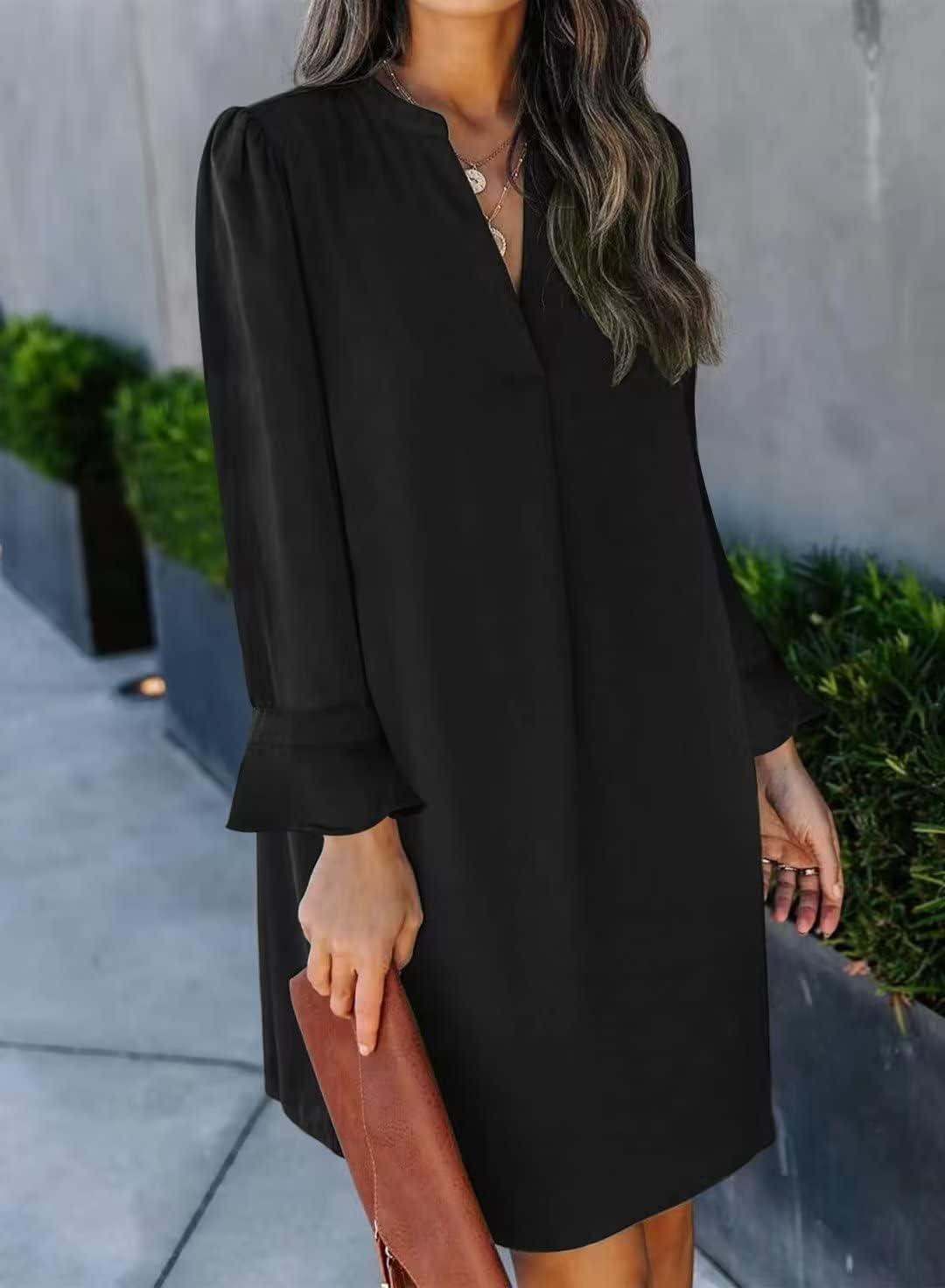 The shift dress silhouette in this design truly elevates both versatility and style with its effortlessly flattering cut. its loose, flowy structure allows for comfort and freedom of movement while maintaining a sleek, clean line that suits various body types. The long sleeves combined with a V-neckline create a balanced silhouette perfect for layering or wearing alone, making it an ideal piece for different seasons and occasions.Whether paired with sandals for a casual day out or heels for an evening event, the dress transitions seamlessly, highlighting how adaptable a modern wardrobe essential can be.
