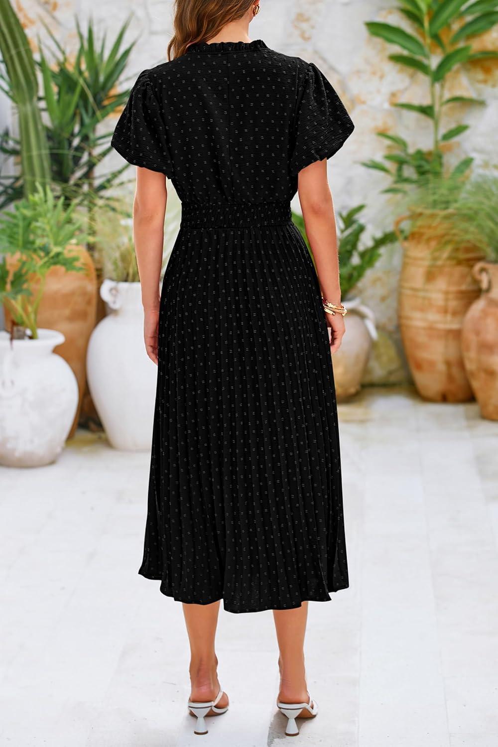 Our experience with this summer midi dress has been genuinely satisfying, thanks to its effortlessly elegant design and comfortable fit. The puff short ​sleeves and V-neckline create a flattering silhouette that balances charm with sophistication. The ⁤subtle Swiss dot pattern adds a delicate texture, while the pleated A-line skirt flows gracefully, making it suitable for various occasions – from casual outings to‌ wedding guest events. The lightweight fabric feels breathable and soft ⁢against the skin, making it ideal for warm weather without compromising style.