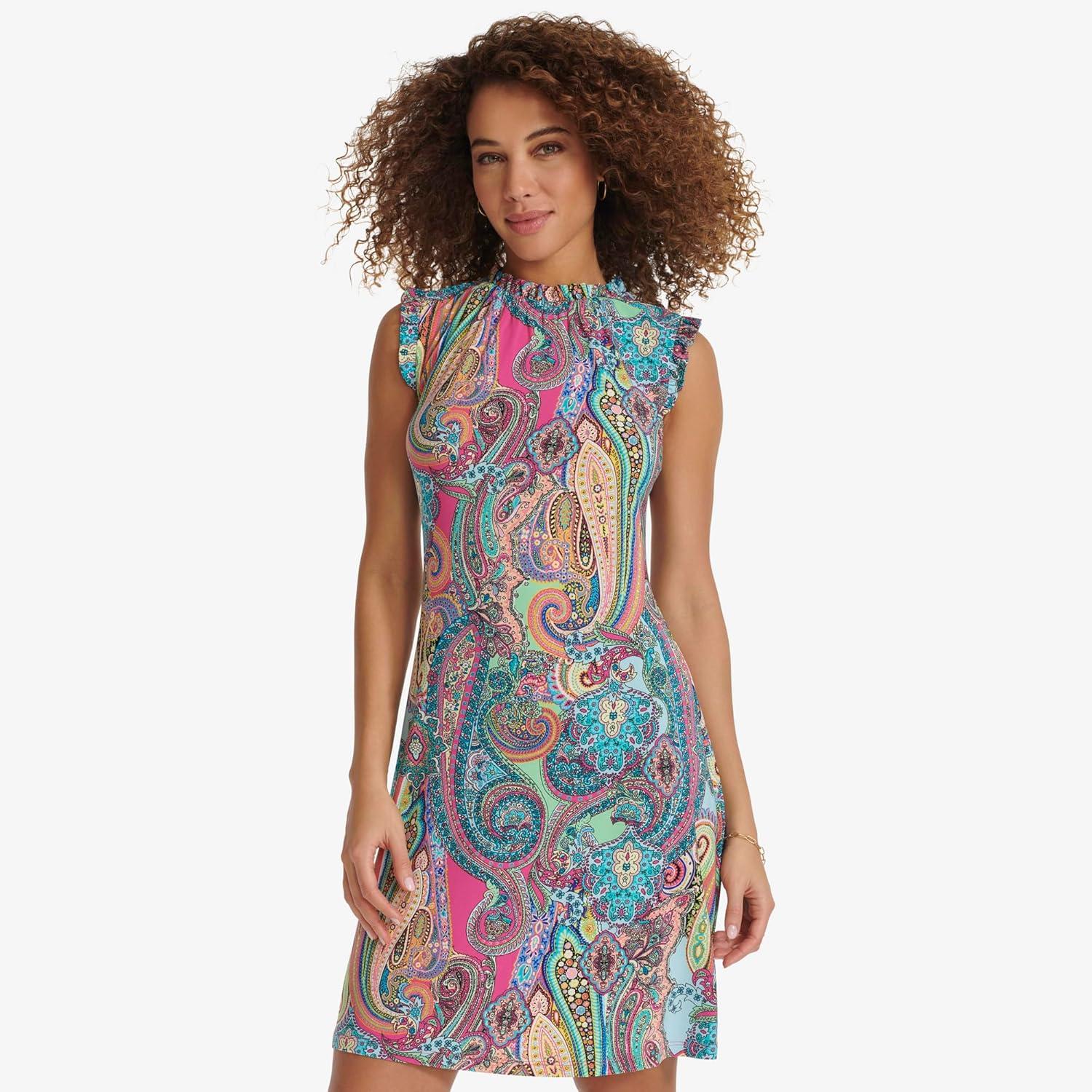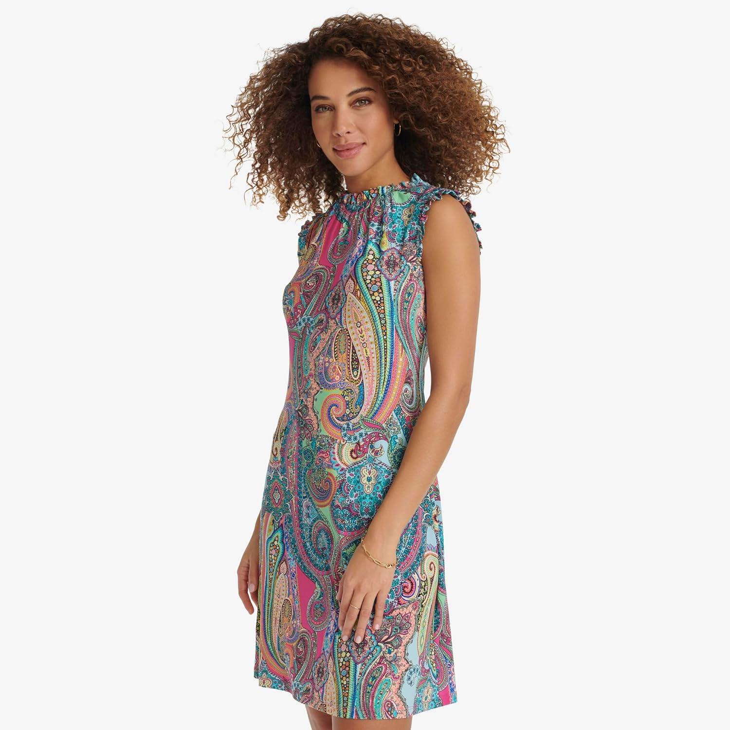 What truly captures our attention in this sleeveless jersey dress is its elegant ruffle neck detail, which adds a subtle yet elegant flair to a classic shift silhouette. The soft, flowy fabric gracefully drapes without clinging, offering comfort while maintaining a polished look. We also appreciate how the floral accents enhance the overall feminine charm without overwhelming the design, making it versatile for both casual outings and dressier occasions.