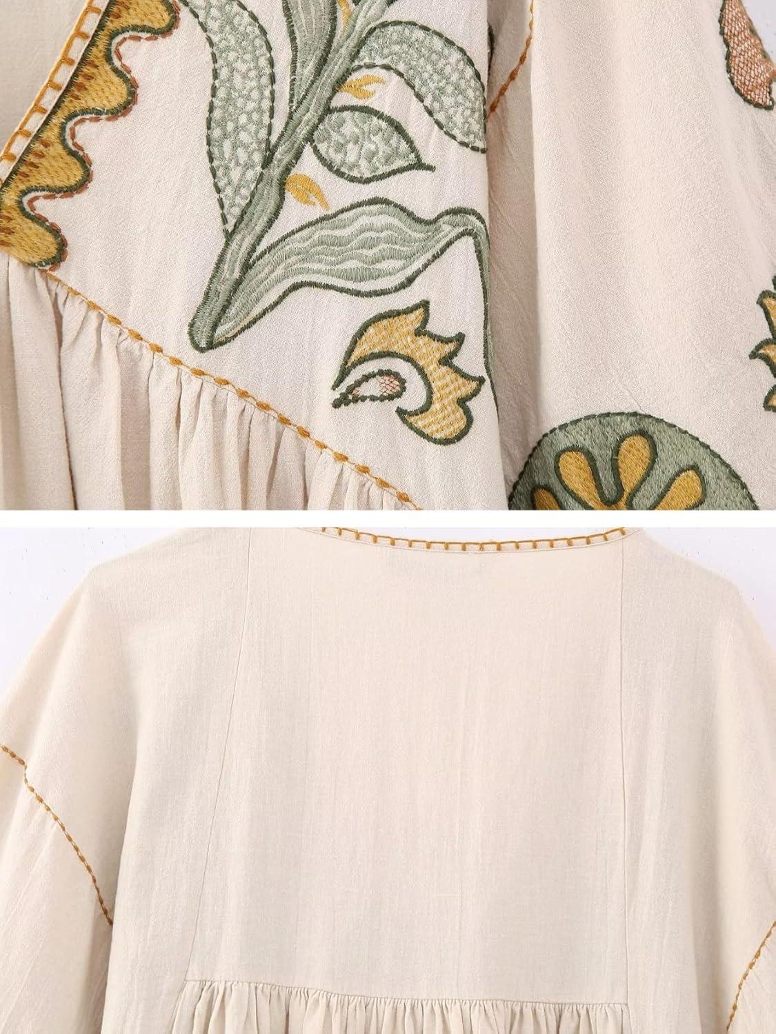 | Fabric | Linen blend, breathable | Vintage floral embroidery details |
