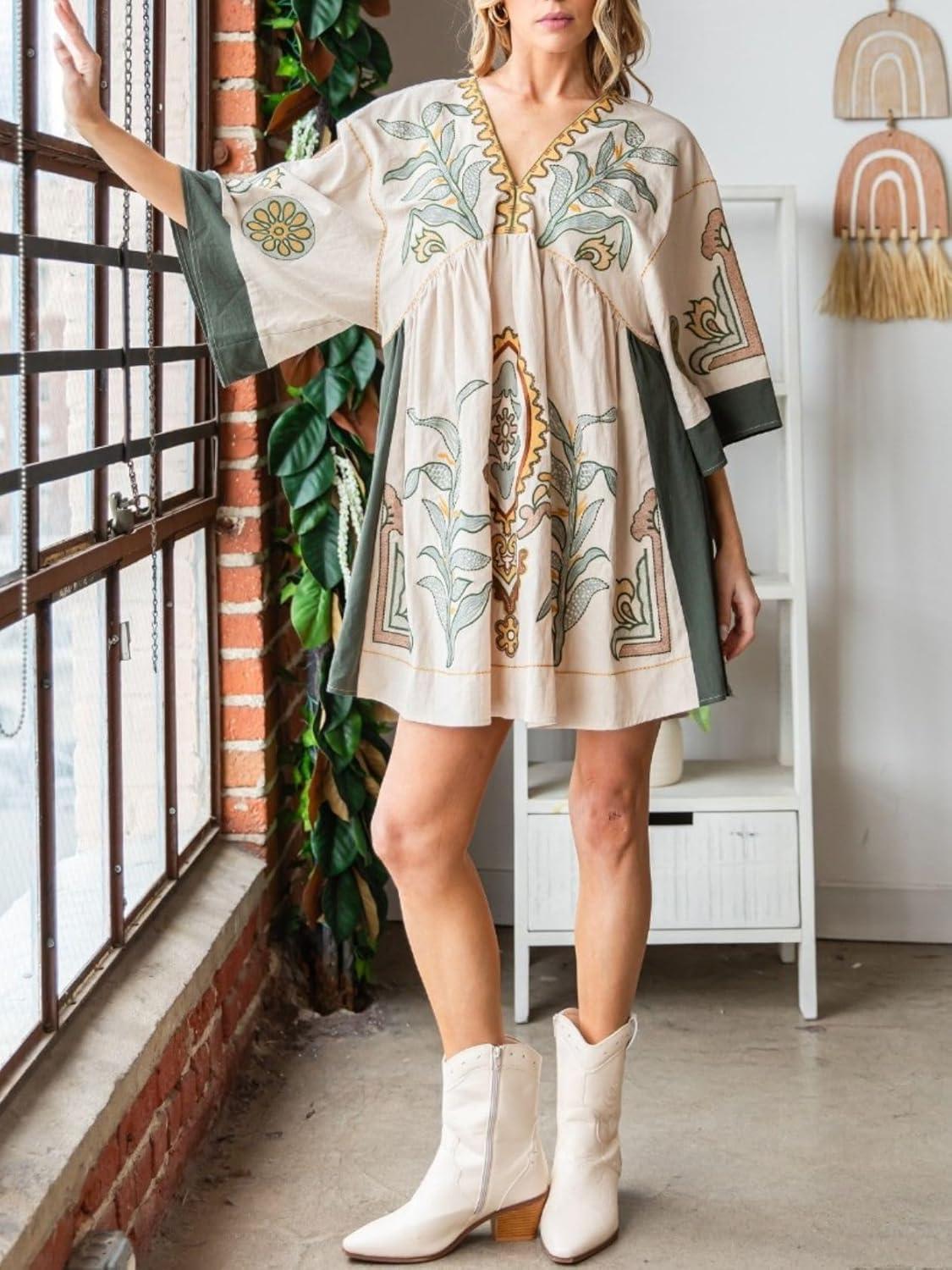 Delving into the intricate vintage embroidery, this dress embraces a nostalgic charm that elevates its overall aesthetic. The delicate floral motifs are thoughtfully stitched across the bodice and sleeves, creating a subtle yet captivating texture. This handcrafted detail exudes an artisanal feel, reminiscent of timeless craftsmanship, while the soft linen blend fabric offers a breathable and comfortable canvas that beautifully complements the embroidery without overwhelming it. The loose fit and babydoll silhouette allow the embroidered elements to flow effortlessly with movement, making the design feel both elegant and effortlessly casual.