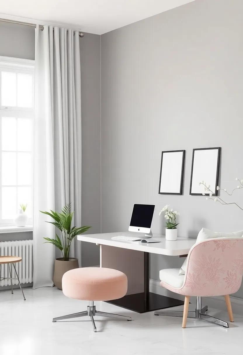Creating​ a harmonious work area is essential for⁣ fostering both​ peace⁣ and productivity. The elegant combination of silver-gray⁤ and blush pink sets a gentle⁤ yet ‍stimulating‌ atmosphere,‌ prompting⁢ focus⁤ and creativity. ​Consider ⁣integrating soft textures ⁤through elements like ‍a plush area rug or ​lightly upholstered office chairs, which not only invite comfort but also contribute to ‌a visually cohesive ⁢space. Incorporate‍ natural elements ‍ such as plants or wooden accents to enhance⁣ the ambiance with ⁢a breath ‍of ⁣fresh air. The right lighting can‌ also make a critically important⁤ impact; opt for​ warm-toned bulbs ⁤or adjustable desk lamps to maintain a⁣ tranquil environment, allowing you to adapt the lighting according to the time ‌of day or⁢ your⁣ mood.